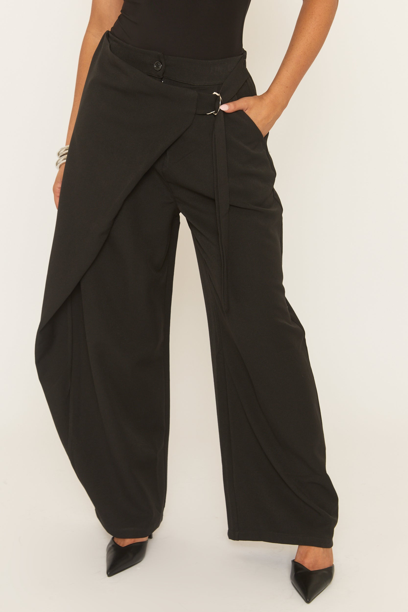 Black Wrap Detail Belted Wide Leg Trousers - Arwa