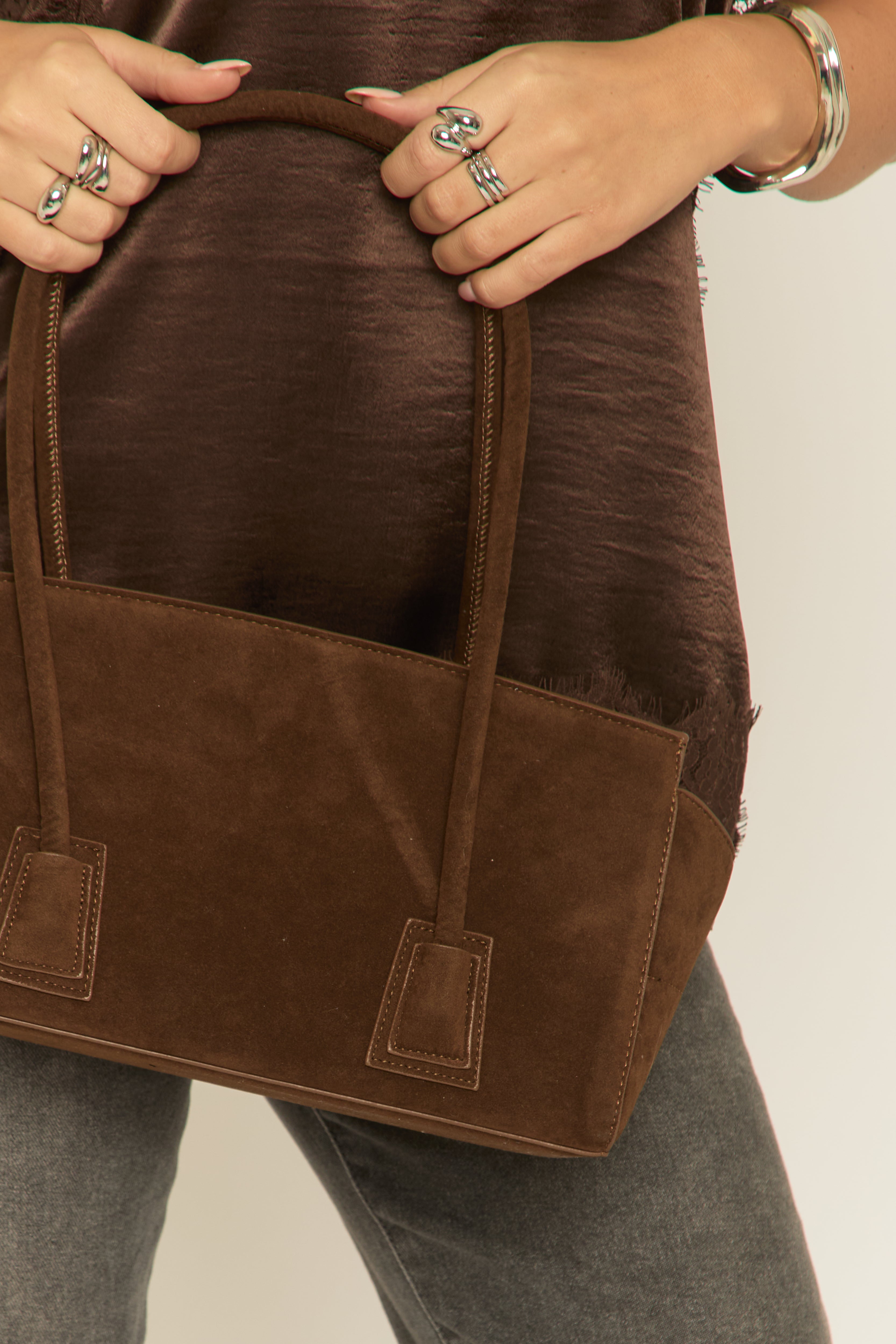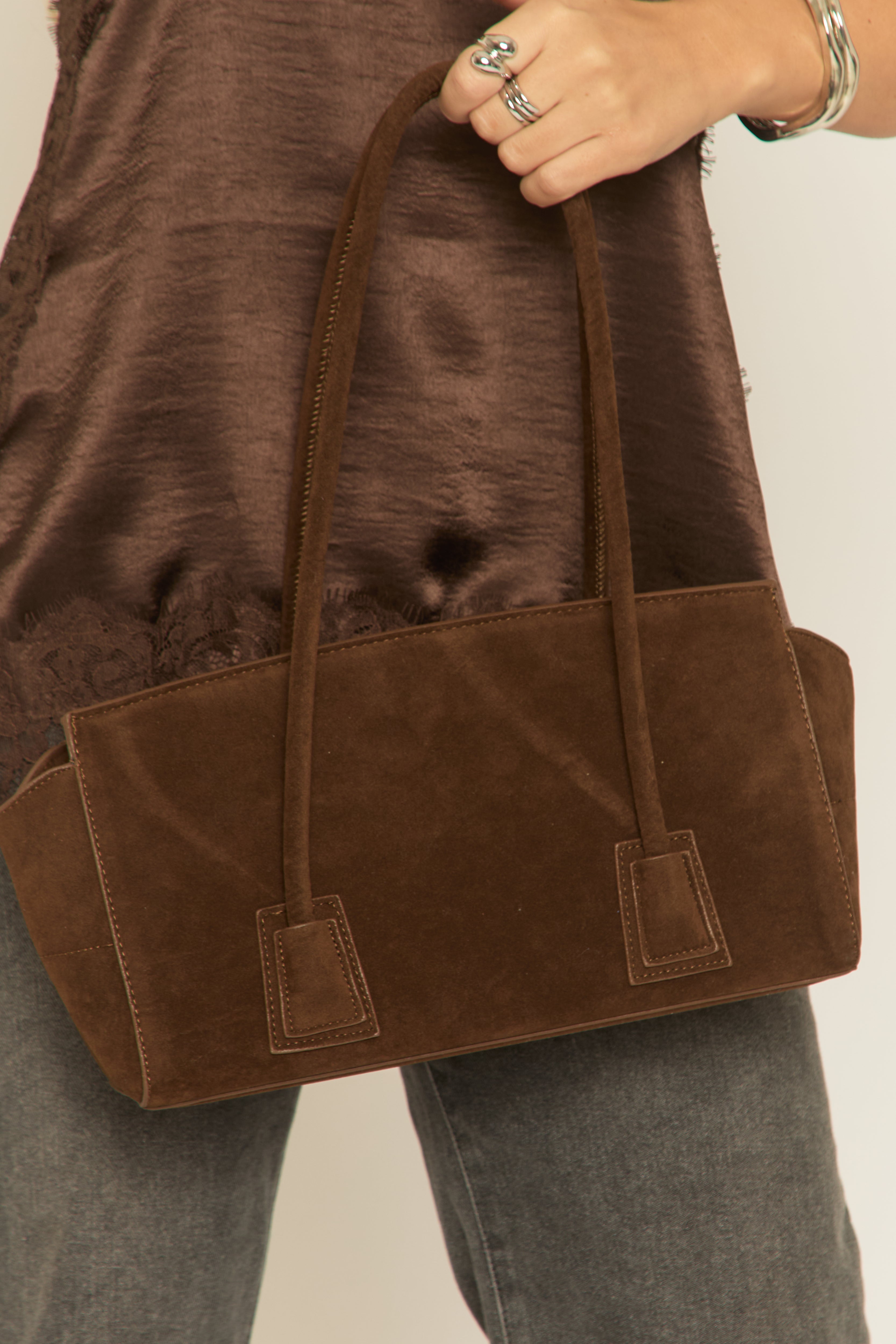 A chic edge with our Brown Faux Suede Shoulder Bag. Featuring a faux suede material, shoulder style and popper fastening. Embrace the season's trends with our thoughtfully curated pieces that are perfect for mixing and matching, allowing you to create countless outfit combinations. Dress it up or down with your favourite staple pieces.