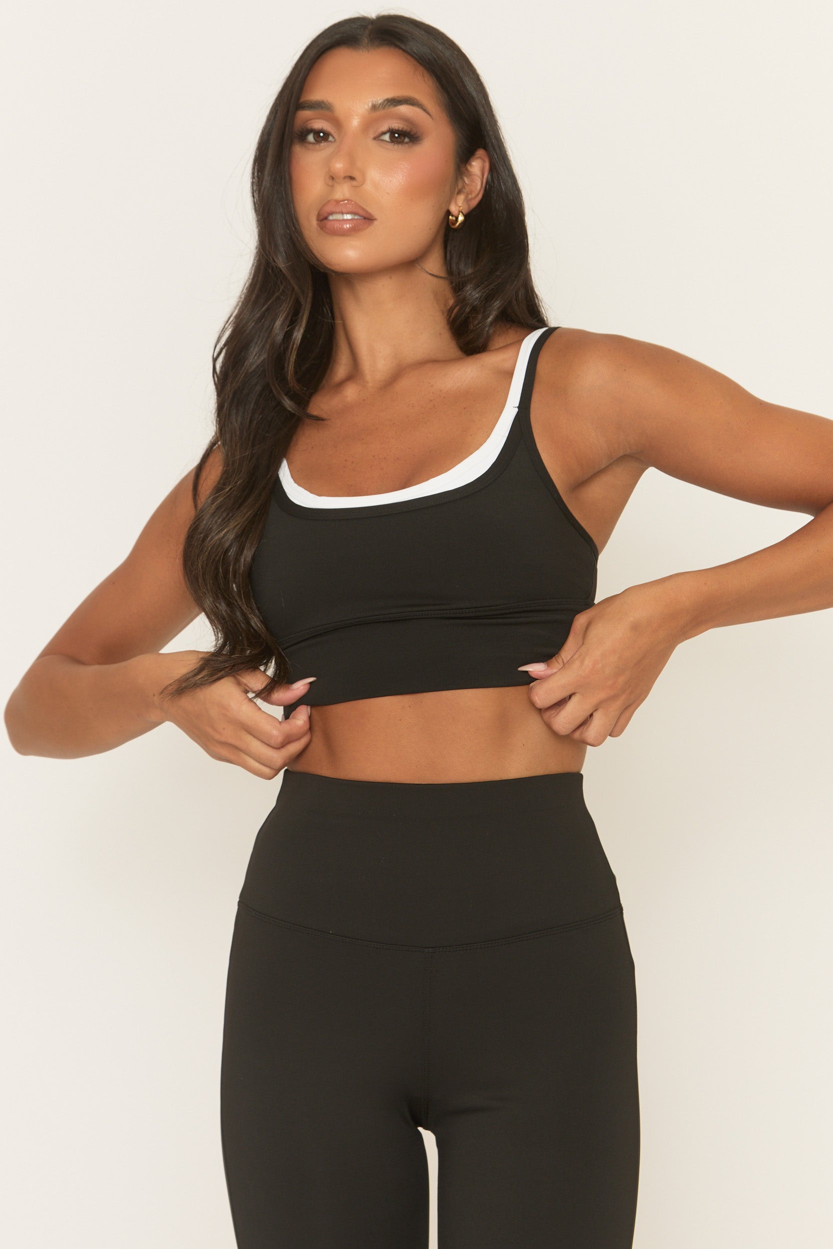 Elevated basics with this Black Contrast Piping Activewear Sports Bra. Featuring a smooth stretch fabric, contrast overlay design with double strap detail, built in cups and cropped length. Embrace the season's trends with our thoughtfully curated pieces that are perfect for mixing and matching, allowing you to create countless outfit combinations. Style with staples to complete.