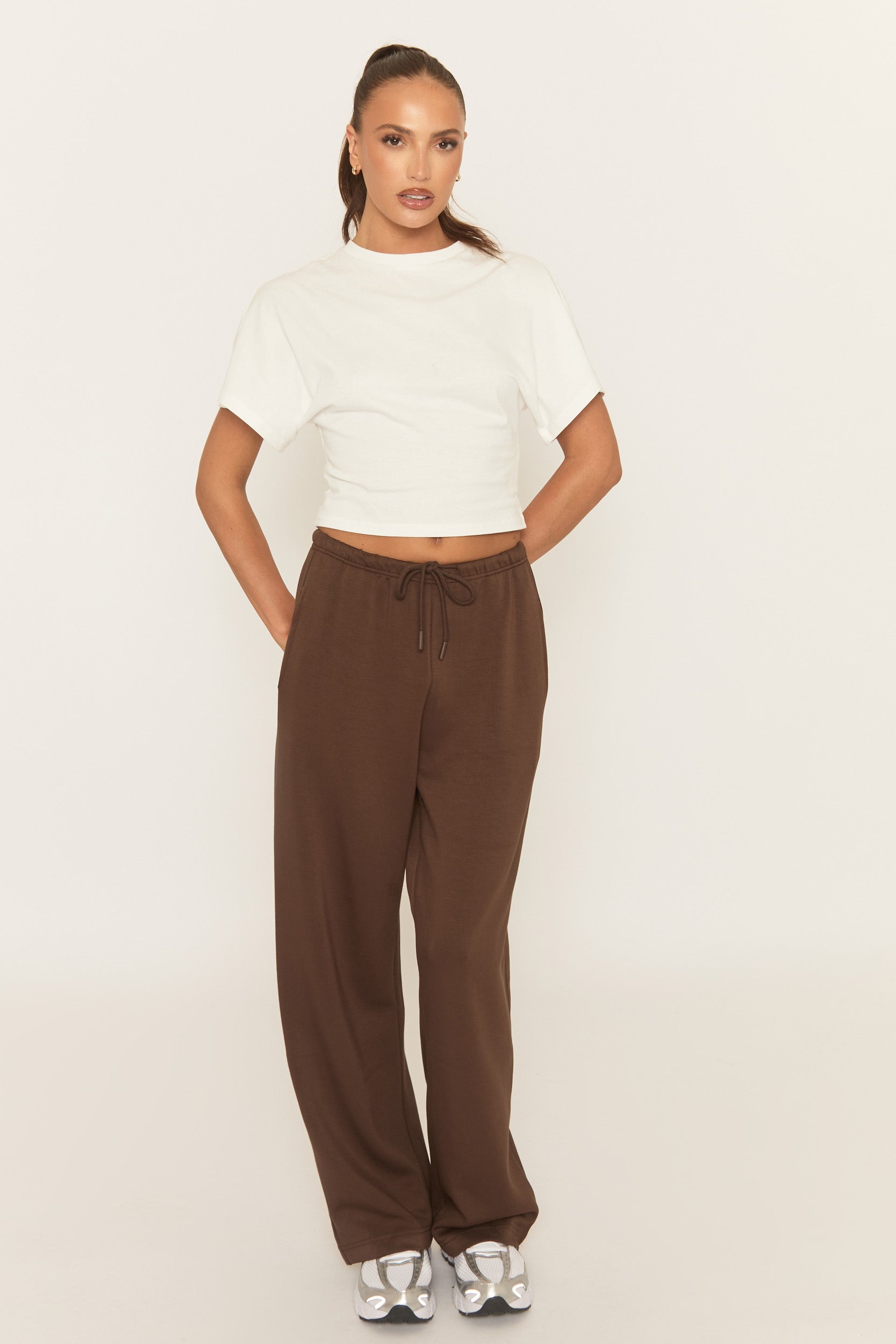 A new season favourite in these Brown Thin Drawstring Waistband Wide Leg Trousers. Featuring a soft jogger fabric, wide leg design with drawstring waist and pockets. Embrace the season's trends with our thoughtfully curated pieces that are perfect for mixing and matching, allowing you to create countless outfit combinations. Wear with trainers to complete.