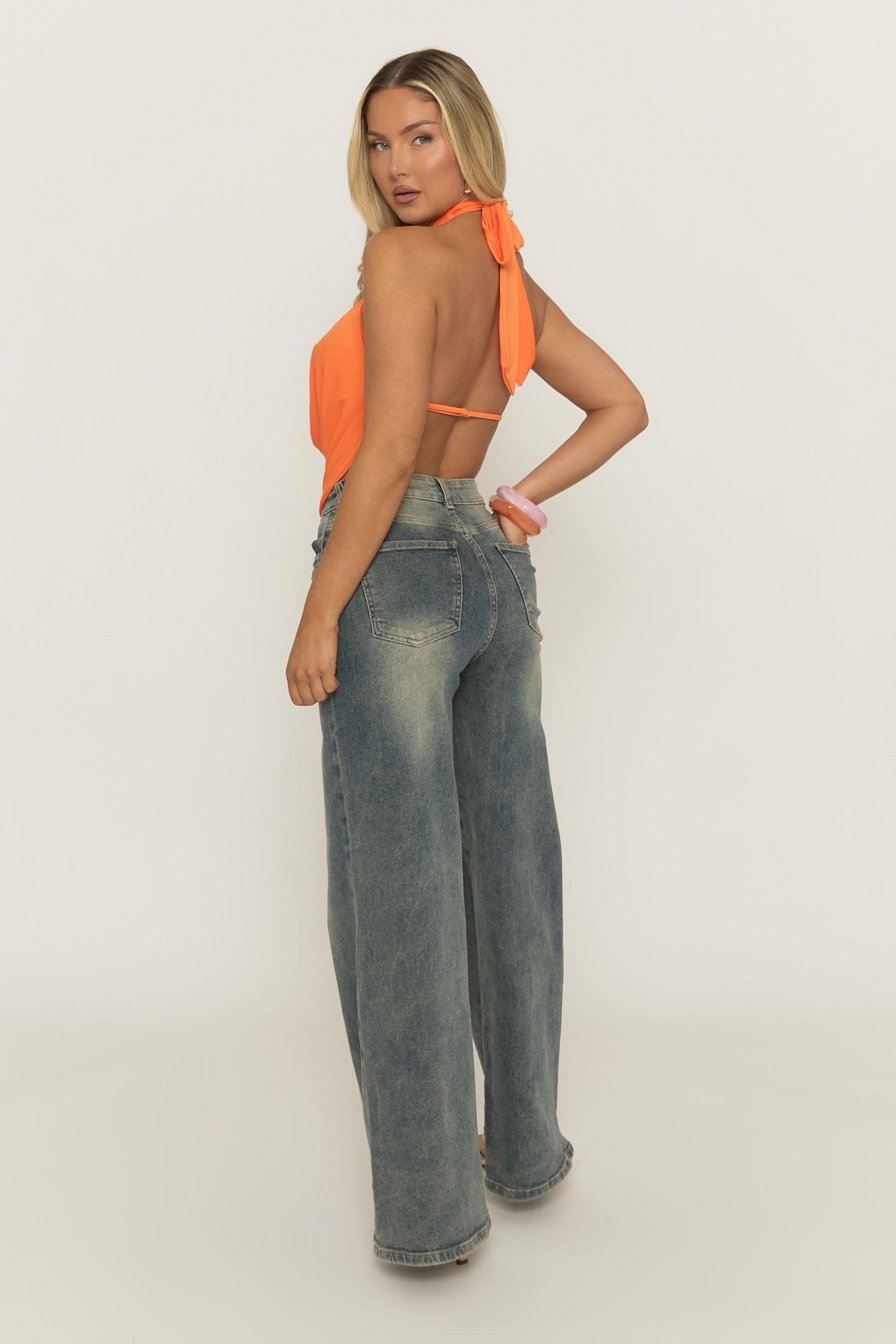 Summer vibes in this Orange Flower Detail Plunge Cowl Halter Top. Featuring slinky fabric, plunge cowl halter design with neck ties, flower detail and backless. Embrace the season's trends with our thoughtfully curated pieces that are perfect for mixing and matching, allowing you to create countless outfit combinations. Add a mini skirt and wedges for the ultimate finish.
