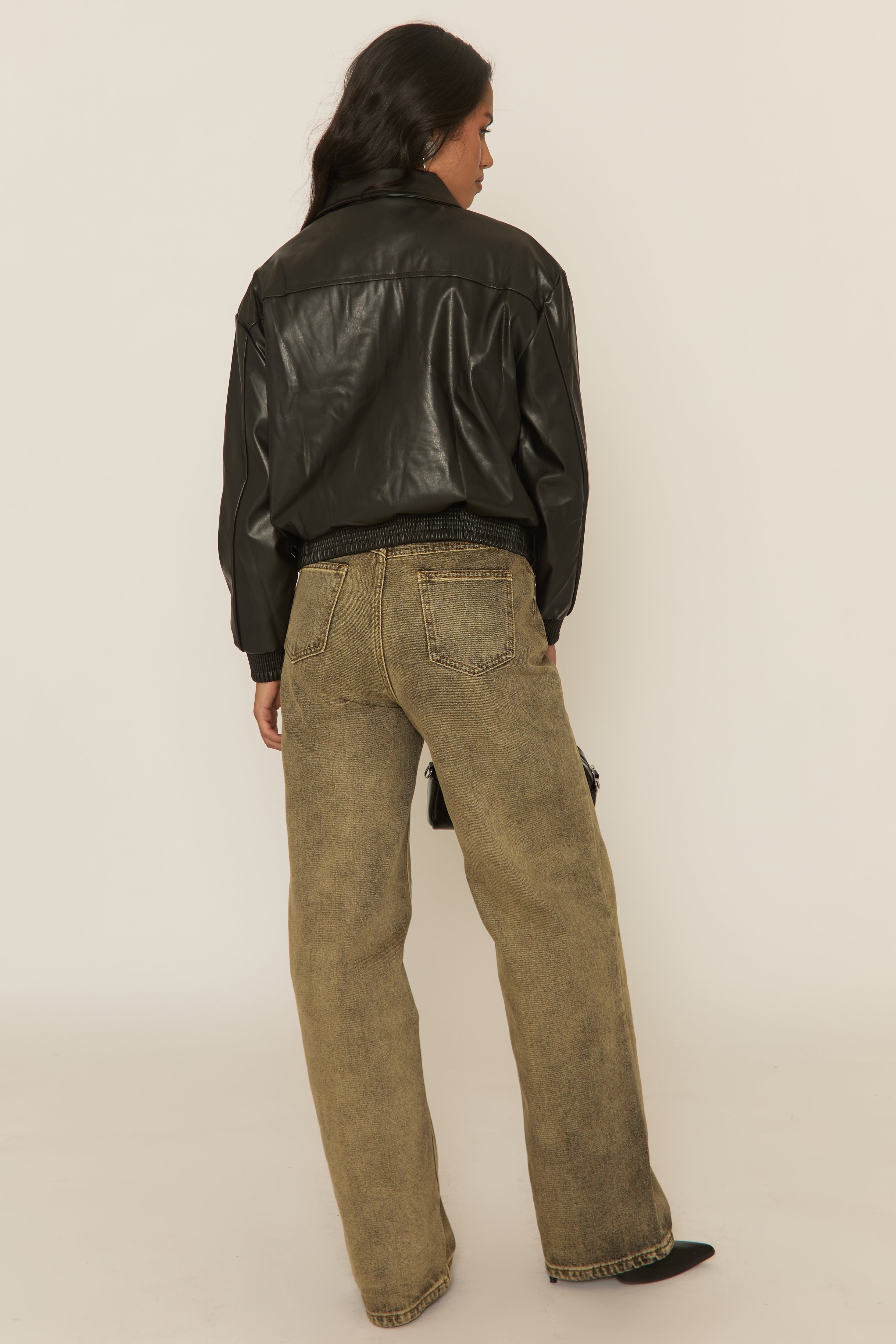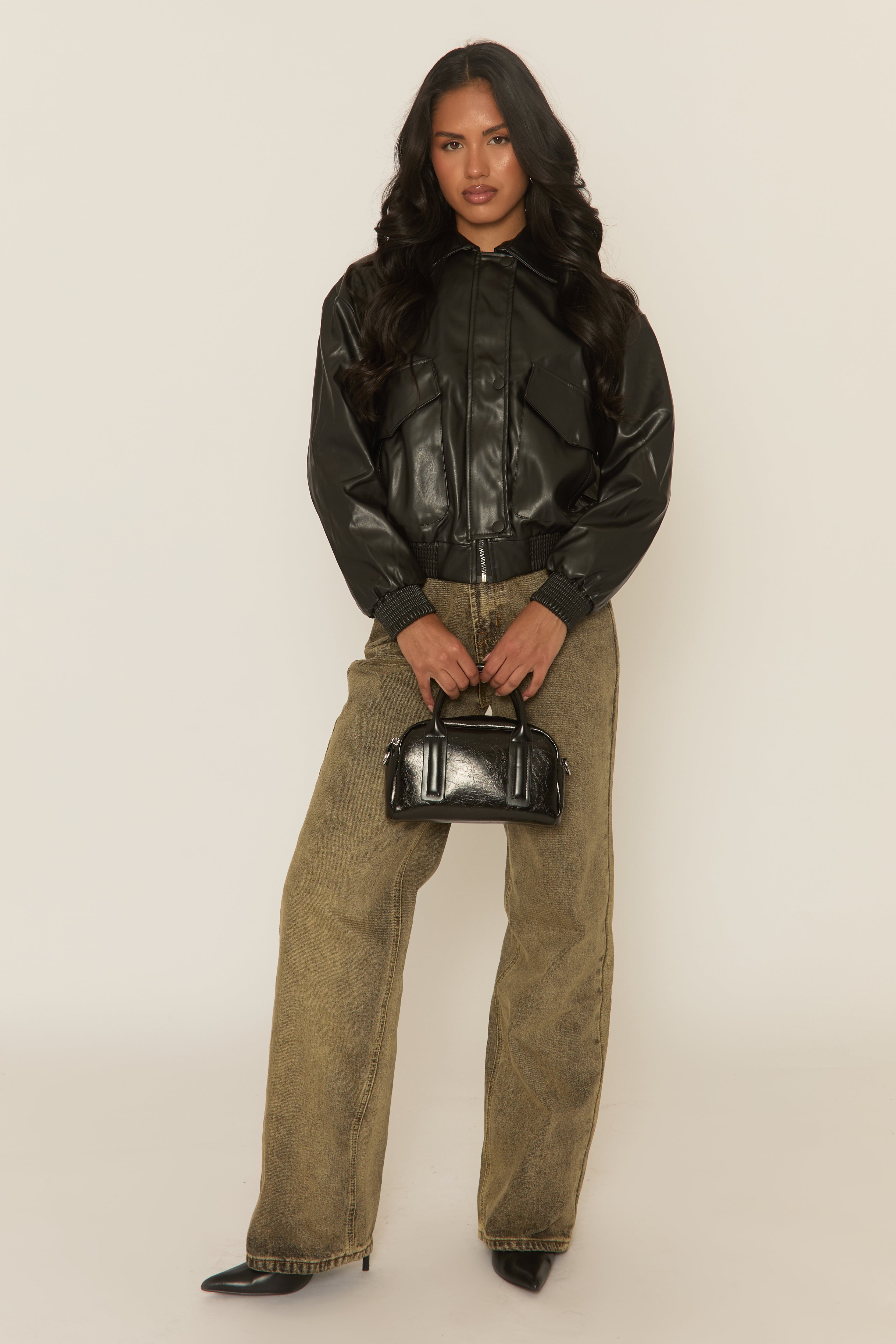Our new go-to with this Black Faux Leather Collared Zip Front Bomber Jacket. Featuring a PU faux leather fabric, collared design, front pocket detail, zip through with popper fastenings and elasticated hem. Embrace the season's trends with our thoughtfully curated pieces that are perfect for mixing and matching, allowing you to create countless outfit combinations. Layer over leggings and knitwear for a statement look.