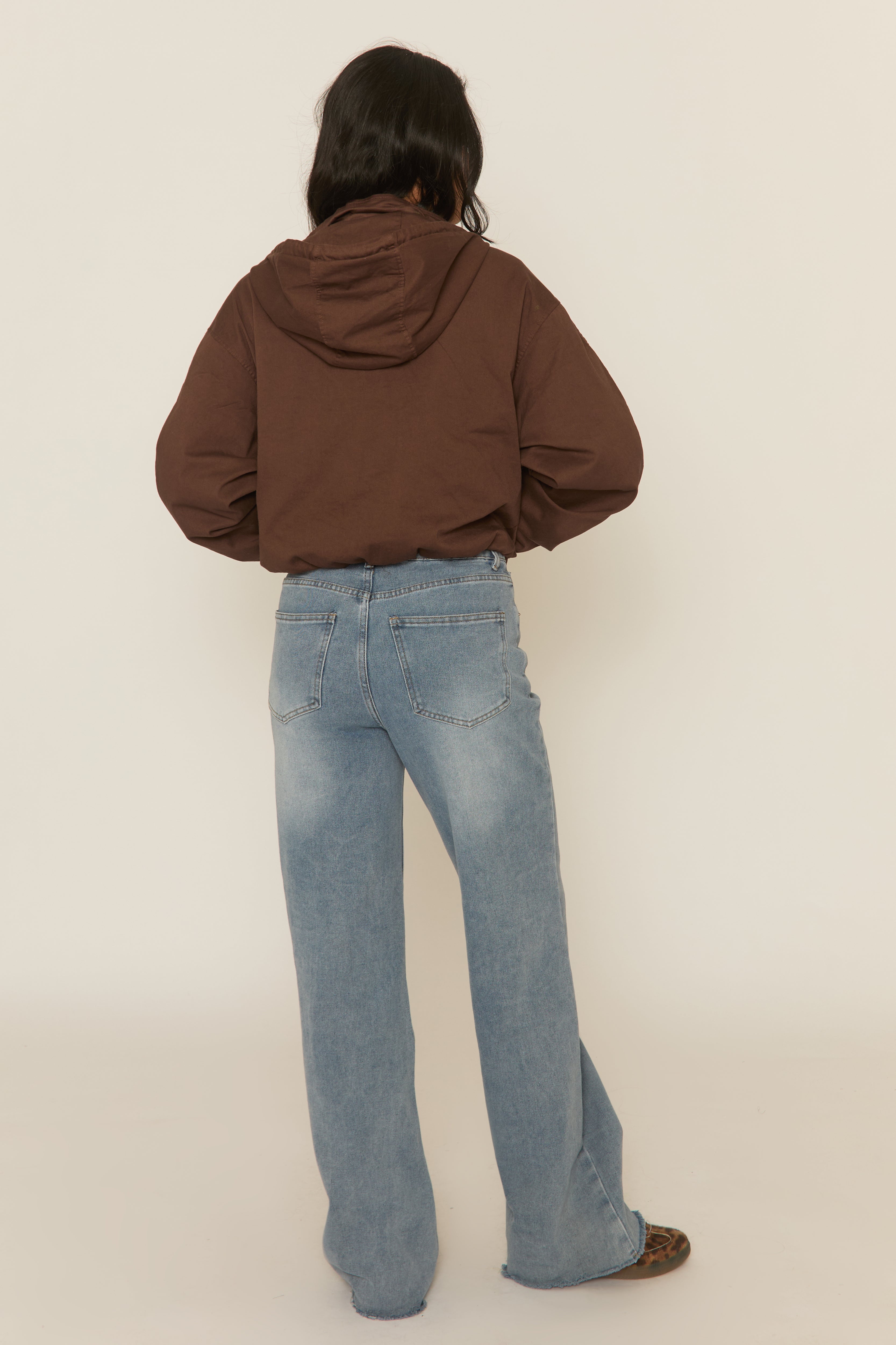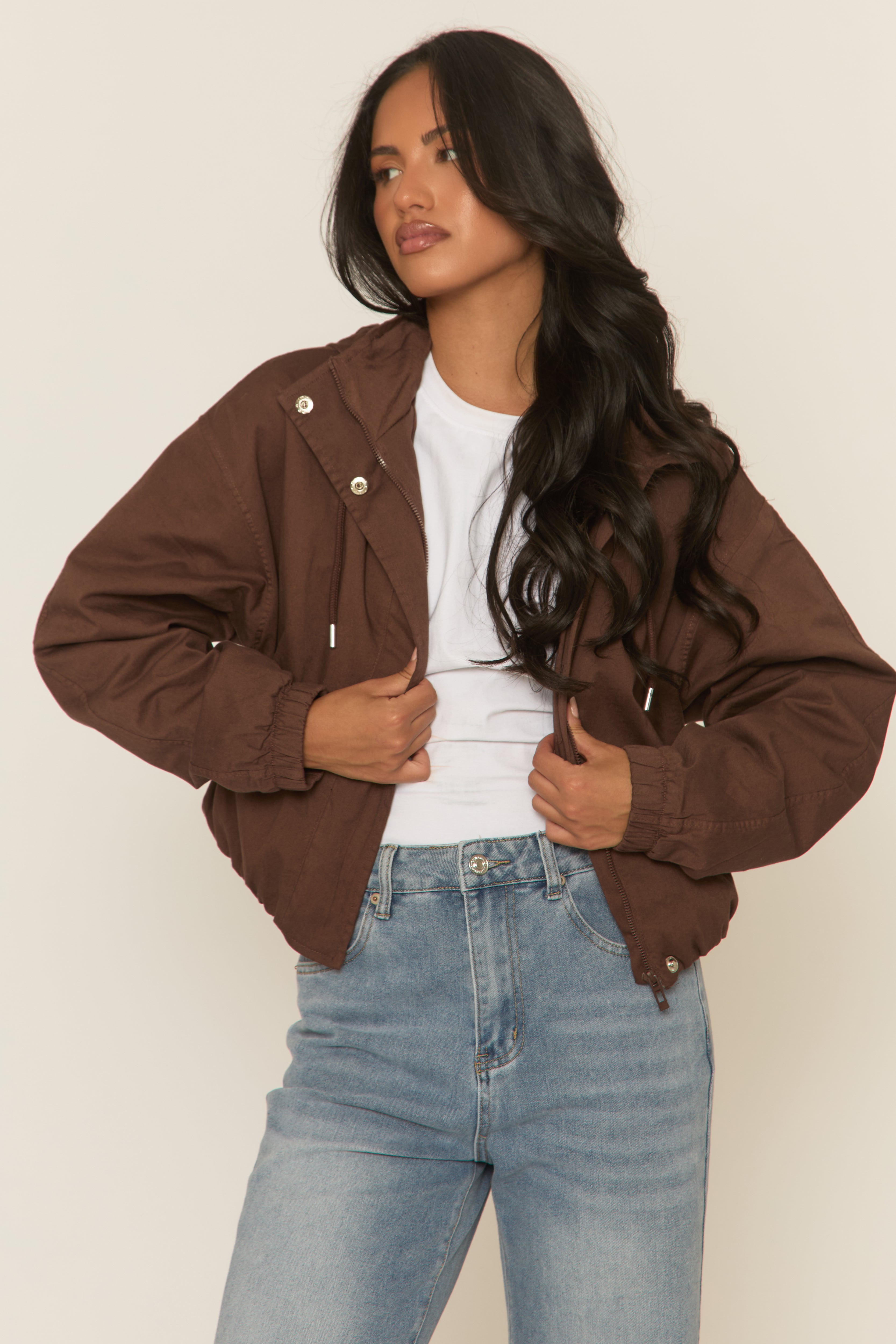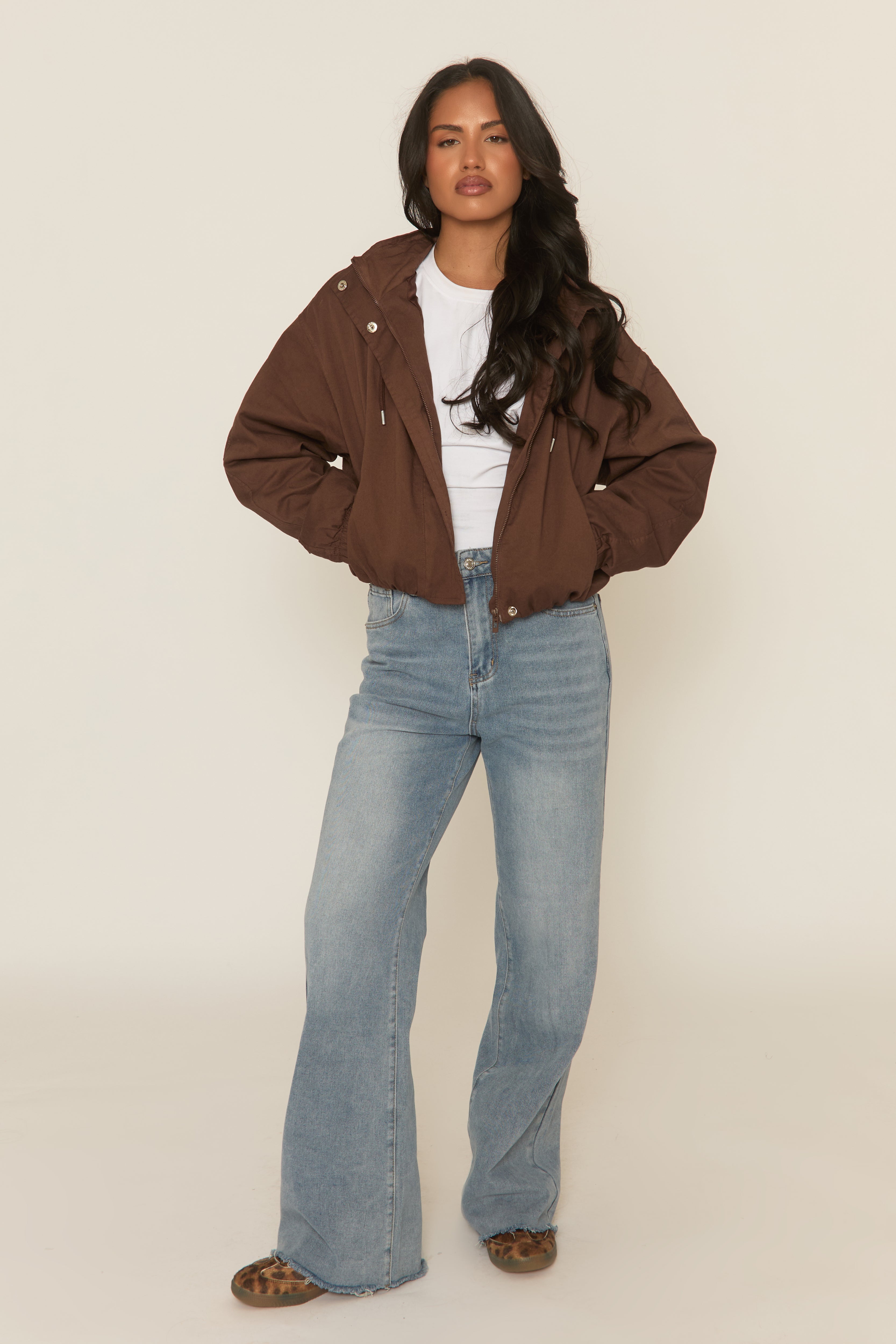 Made for off-duty styling with this Chocolate Hooded Bomber Jacket. Featuring a jersey fabric, hooded design with front zip, gathered hem detail and oversized fit. Embrace the season's trends with our thoughtfully curated pieces that are perfect for mixing and matching, allowing you to create countless outfit combinations. Add denim and knee high boots to complete.