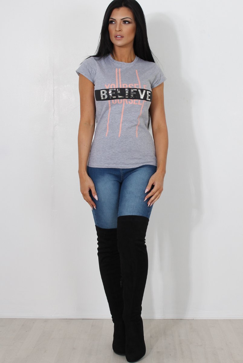 Never say never in this believe slog top. A season must have for your casual wardrobe. Whether you are lounging around the house or shopping in comfort simply style this up with a skinny pair of jeans and some slip on skater.
