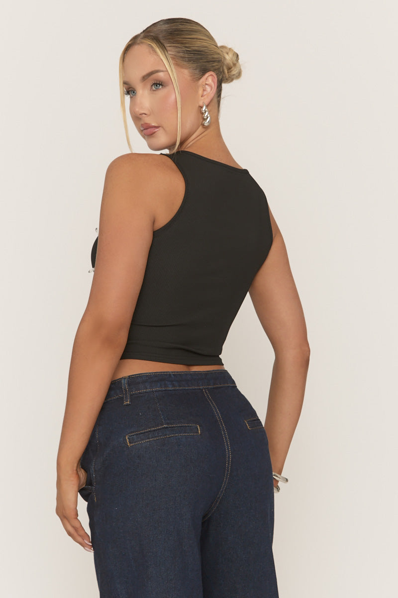 Amp up your casual wardrobe with this Black Rib Crystal Embellished Tank Top. Featuring a rib fabric, crystal embellishment, scoop neck and sleeveless. Embrace the season's trends with our thoughtfully curated pieces that are perfect for mixing and matching, allowing you to create countless outfit combinations. Wear accessories of choice to complete your look.