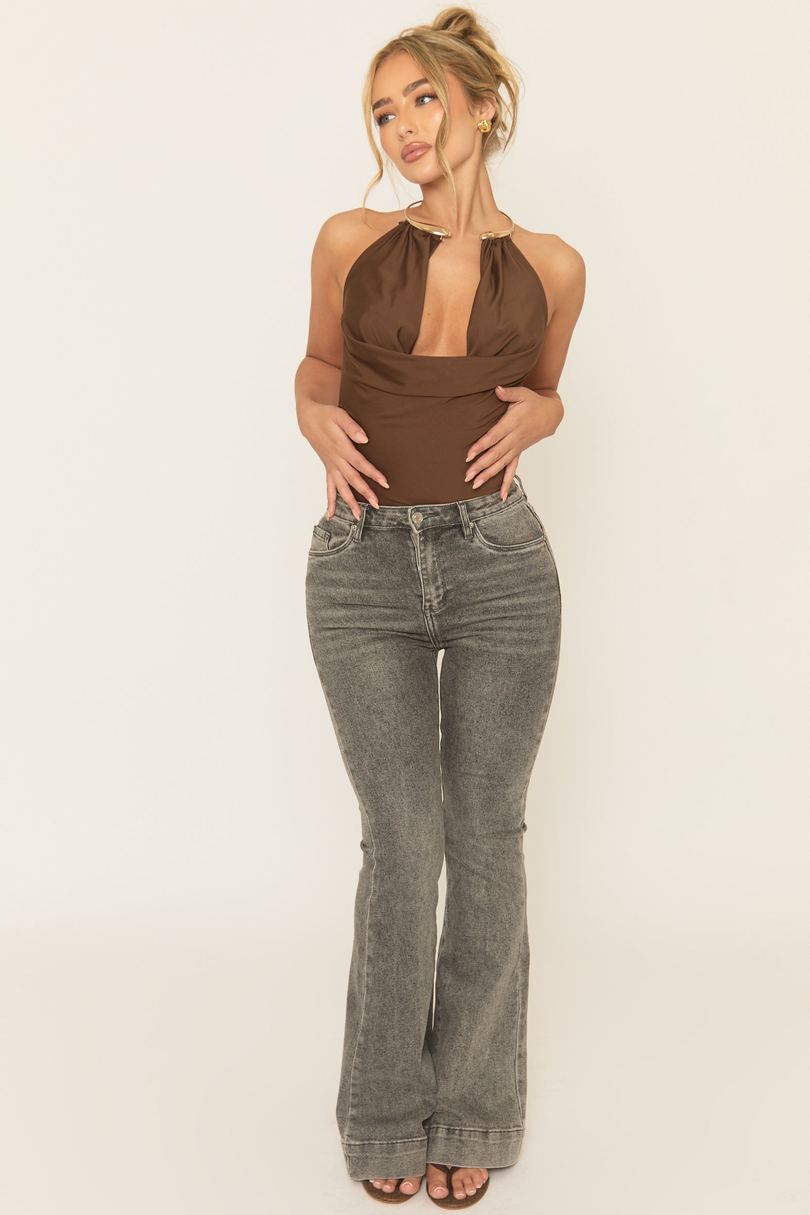 A glam edge for new season with this Chocolate Gold Trim Cowl Neck Bodysuit. Featuring a jersey fabric, cowl neck design with gold ring trim detail and crotch fastenings. Embrace the season's trends with our thoughtfully curated pieces that are perfect for mixing and matching, allowing you to create countless outfit combinations. Add wide leg jeans and heels for a look we're loving.