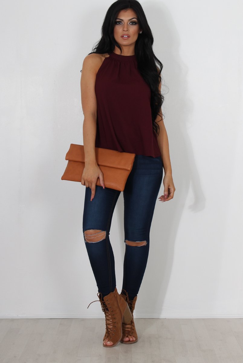 This Francis Wine High Neck Top is a must have for that classy yet casual look. Team this up with a pair oh high waited jeans and statement heals and you are ready for a few cocktails with the girls.