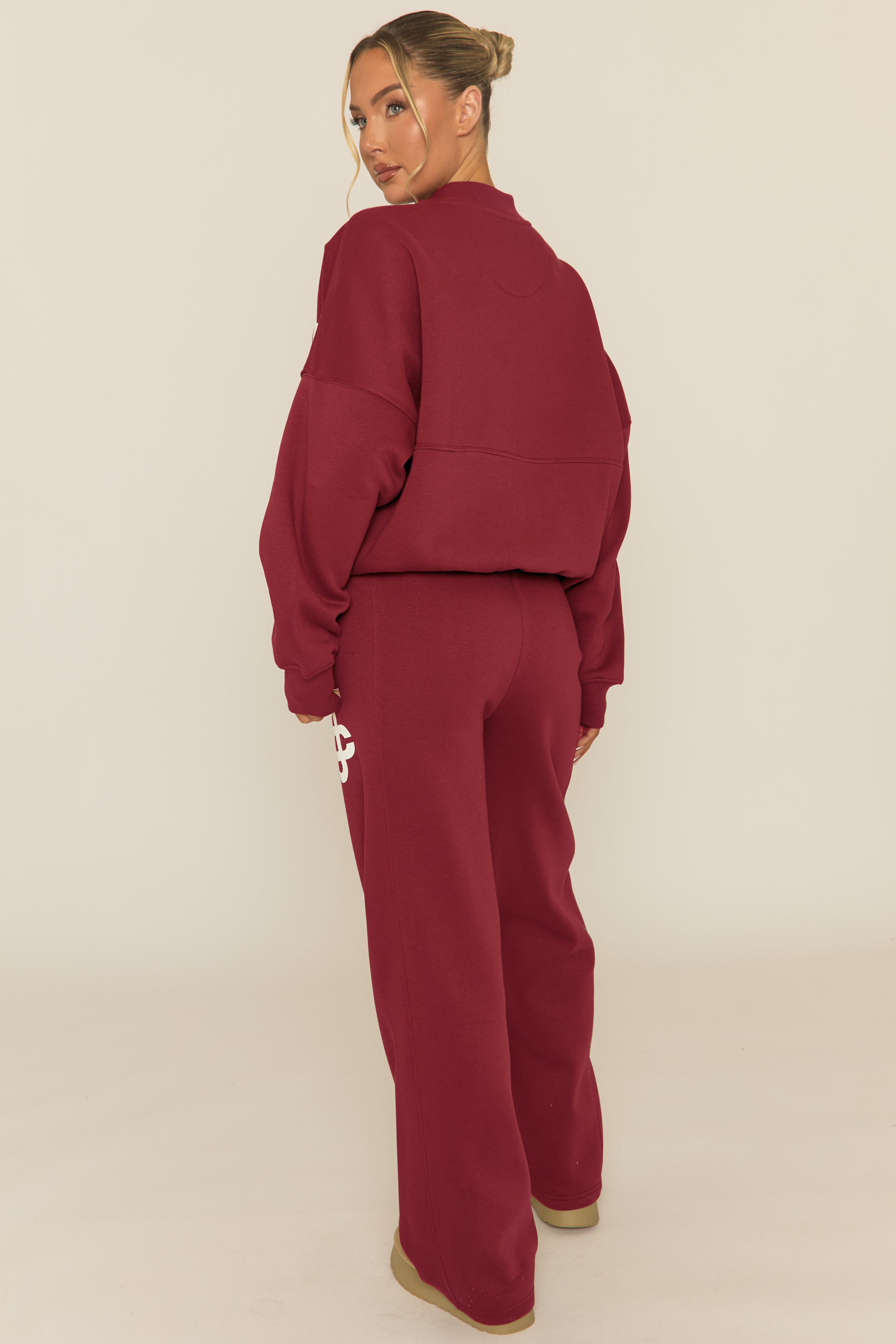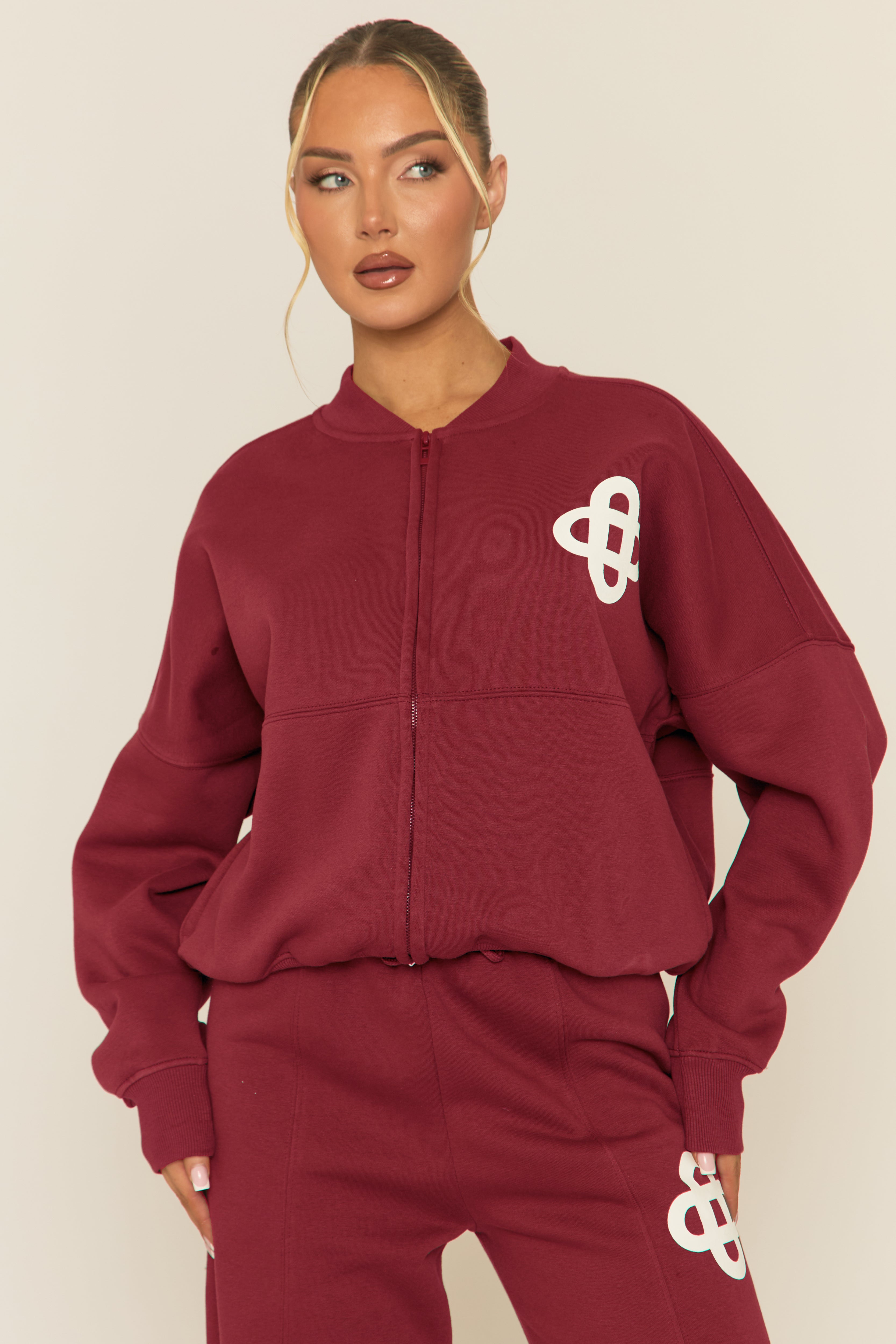 Wine Contrast Motif Zip Front Bomber And Joggers Loungewear Co-ord Set