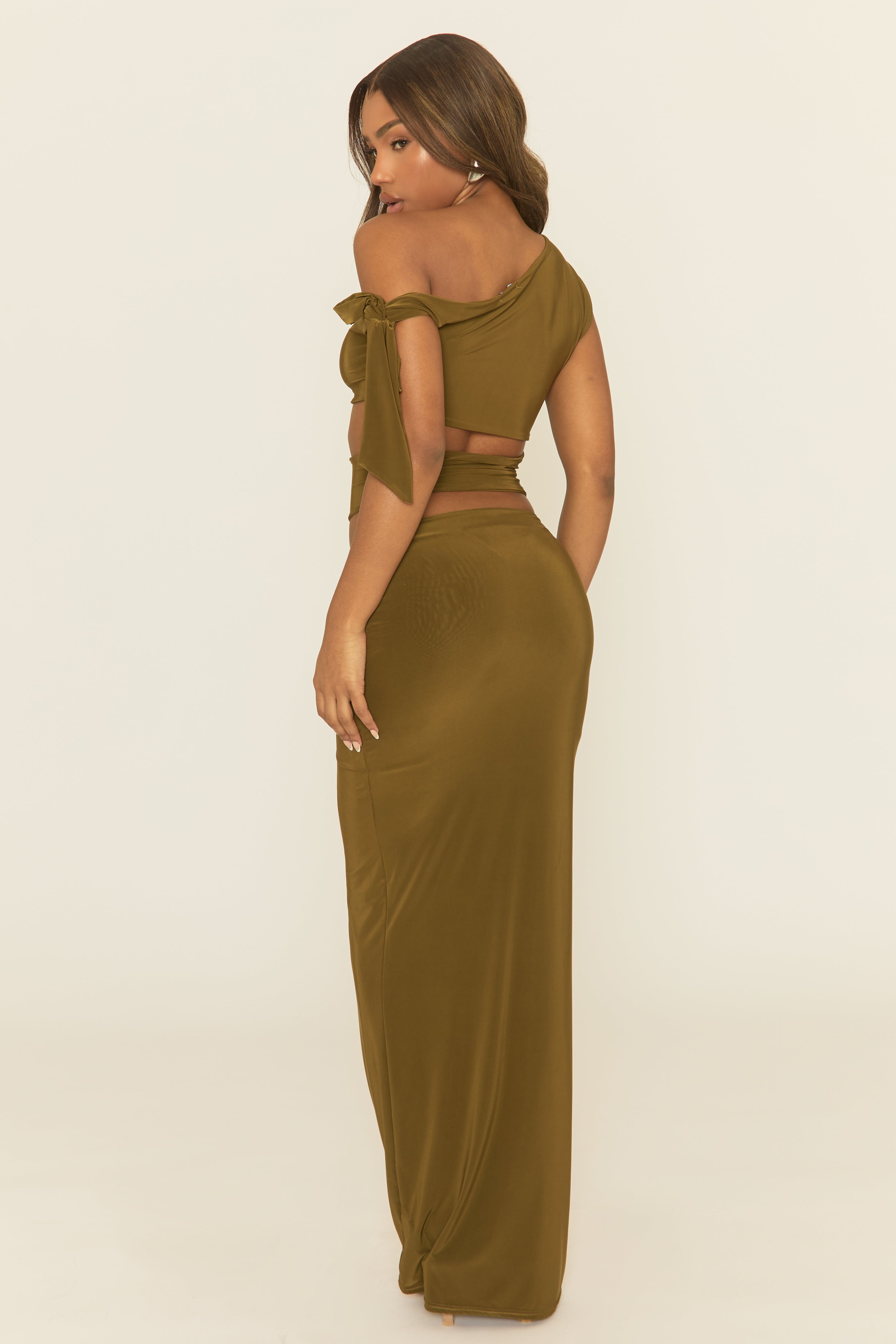Khaki Asymmetric Tie Shoulder Top and Maxi Skirt Co-ord Set - Kofi
