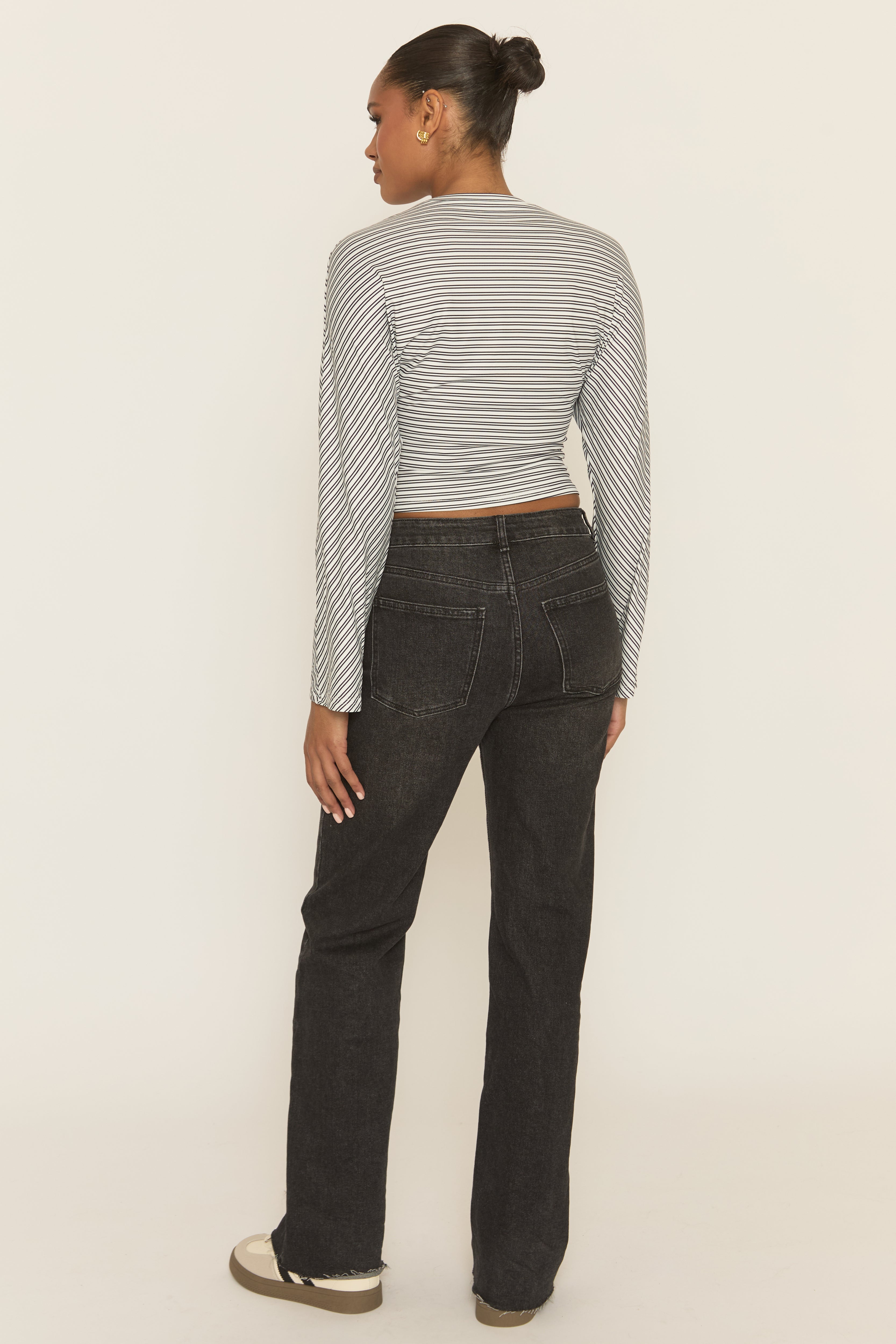 Anything but basic in this White Striped Cinched Waist Top. Featuring a soft stretch jersey fabric, stripe print, flared long sleeve design with cinched waist detail and round neckline. Embrace the season's trends with our thoughtfully curated pieces that are perfect for mixing and matching, allowing you to create countless outfit combinations. Wear with denim and knee high boots for a glam edge.