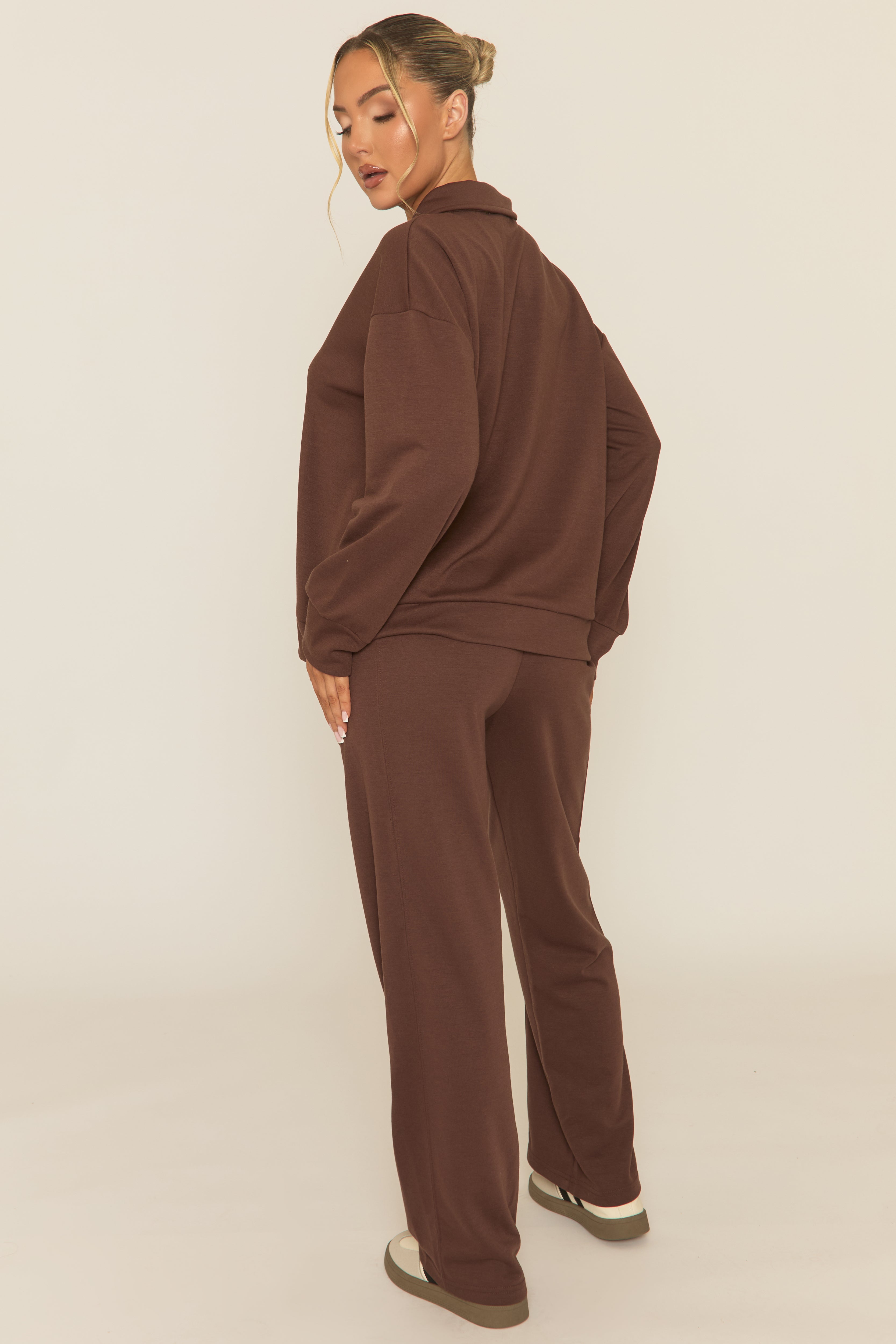 Level your loungewear with this Chocolate Collared Loungewear Set. Featuring a jersey fabric, collared polo sweater design with button detail and the matching seam front straight leg joggers. Embrace the season's trends with our thoughtfully curated pieces that are perfect for mixing and matching, allowing you to create countless outfit combinations. Add faux fur boots for a luxe finish.