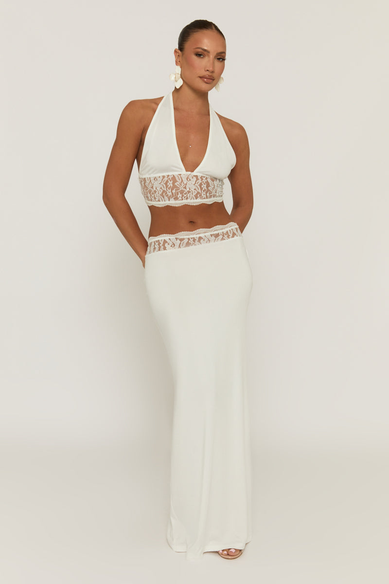 White Crepe Fabric Lace Trim Halter Neck Cropped Top Maxi Skirt Co-ords Model wears size 8