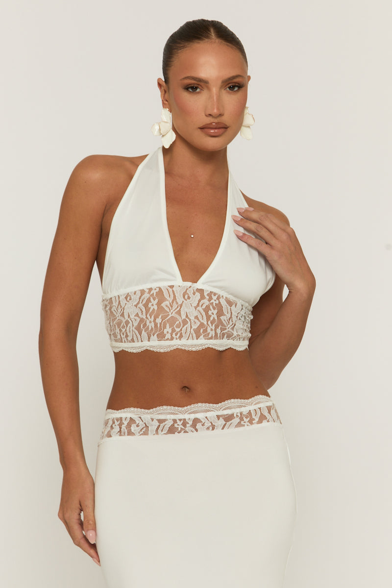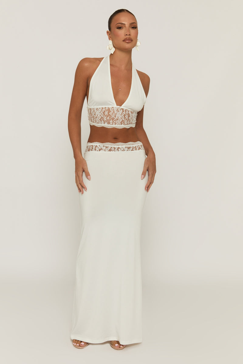 Look fire on your next night out in this White Lace Detail Top and Maxi Skirt Co-ord Set. Featuring a crepe fabric, lace trim, halter neck and a matching maxi skirt. Embrace the season's trends with our thoughtfully curated pieces that are perfect for mixing and matching, allowing you to create countless outfit combinations. Wear with heels and accessories of choice to complete your look.