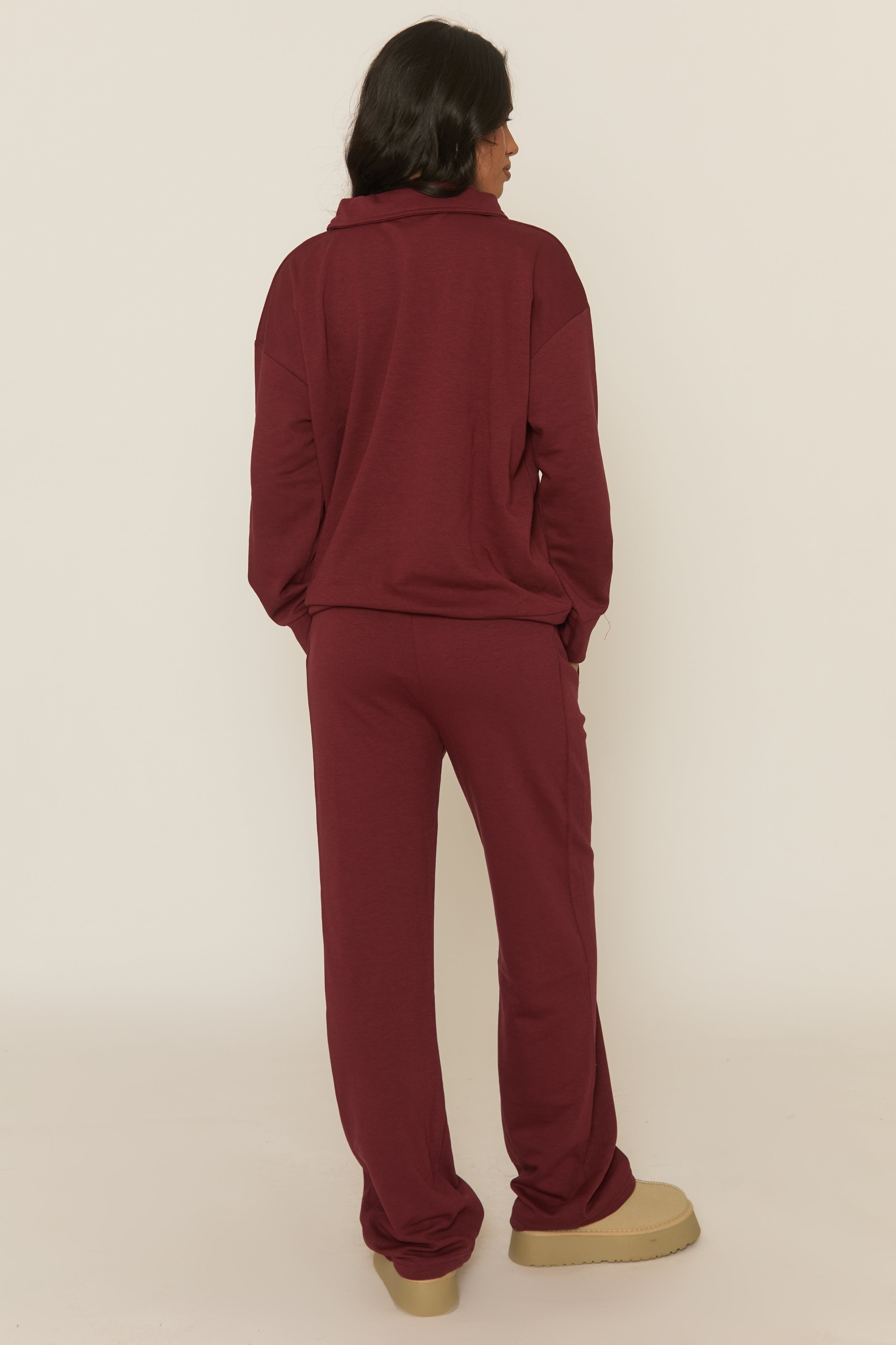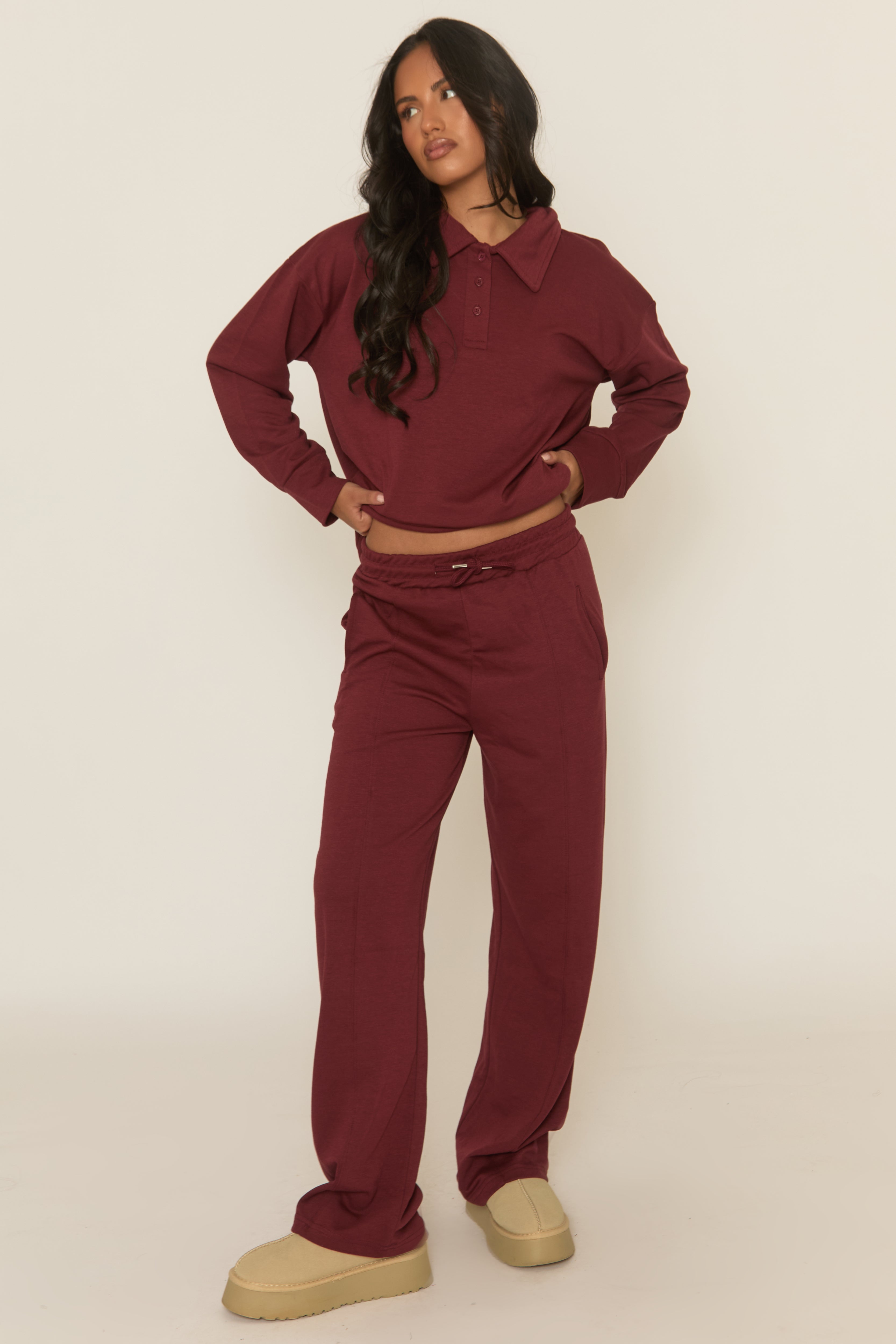 Level your loungewear with this Wine Collared Loungewear Set. Featuring a brushed back lined jersey fabric, collared polo sweater design with button detail and the matching seam front straight leg joggers. Embrace the season's trends with our thoughtfully curated pieces that are perfect for mixing and matching, allowing you to create countless outfit combinations. Add faux fur boots for a luxe finish.