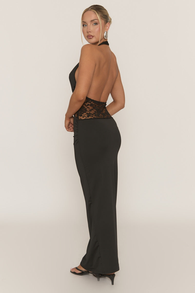 Black Plunge Halter Lace Insert Maxi Dress - Anley