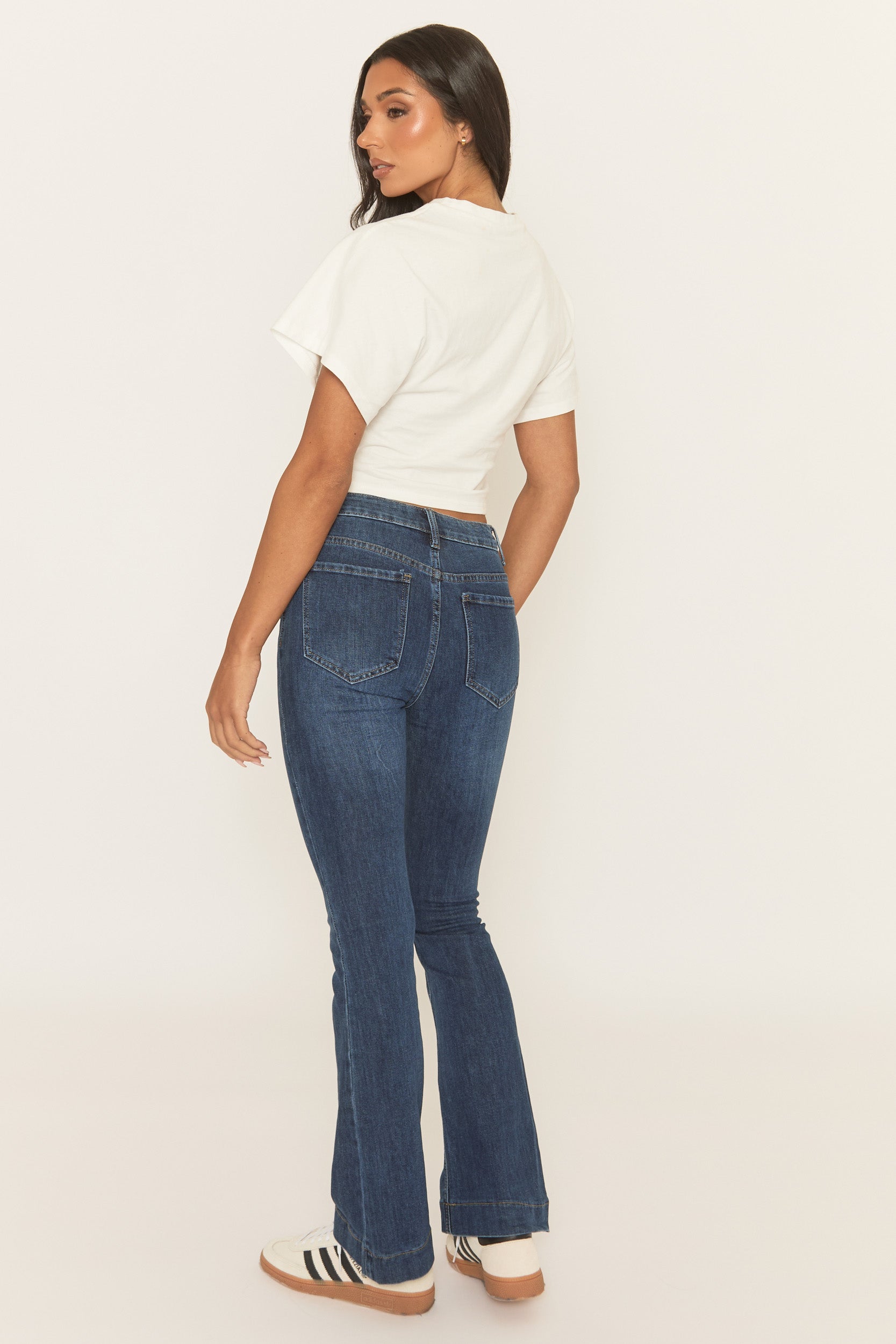 The perfect pair with these Mid Blue Stretch Denim Flare Jeans. Featuring a denim fabric and high waisted flared leg design. Embrace the season's trends with our thoughtfully curated pieces that are perfect for mixing and matching, allowing you to create countless outfit combinations. Dress up or down.