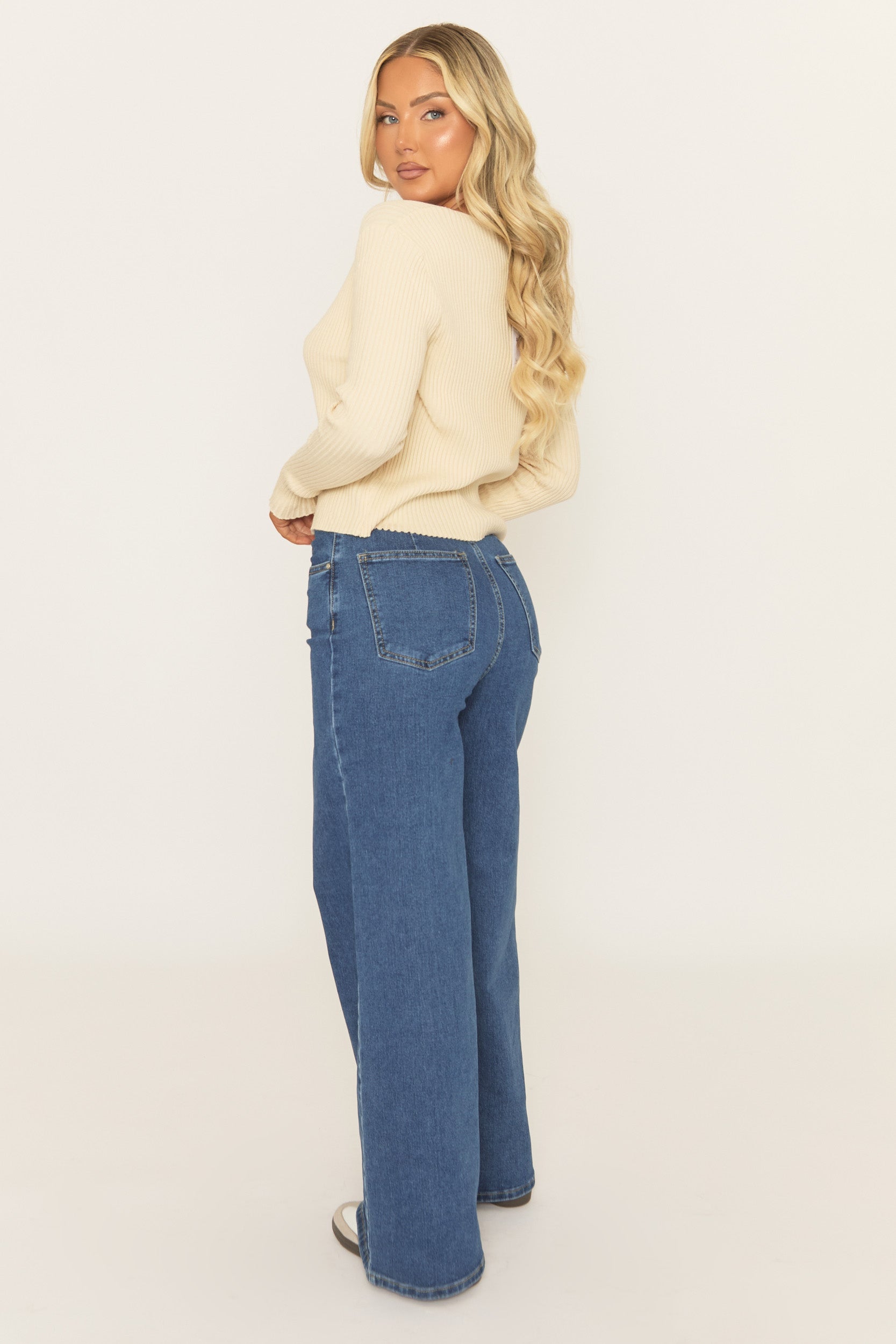 A new staple with these Mid Blue Wide Leg Denim Jeans. Featuring a slight stretch denim fabric, wide leg design with pockets and belt loops. Embrace the season's trends with our thoughtfully curated pieces that are perfect for mixing and matching, allowing you to create countless outfit combinations. Add a basic top and chunky trainers for off duty days.