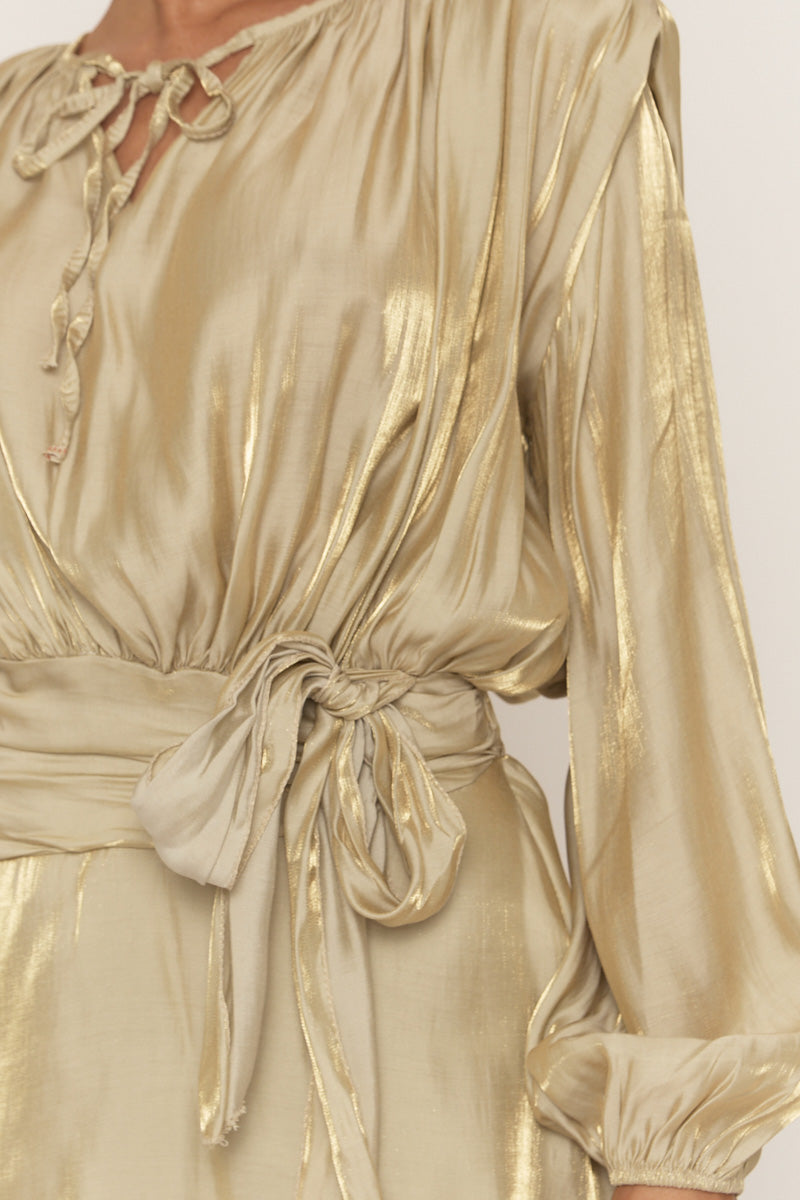 Gold Long Sleeve Tie Detail Ruffle Dress - Zeta