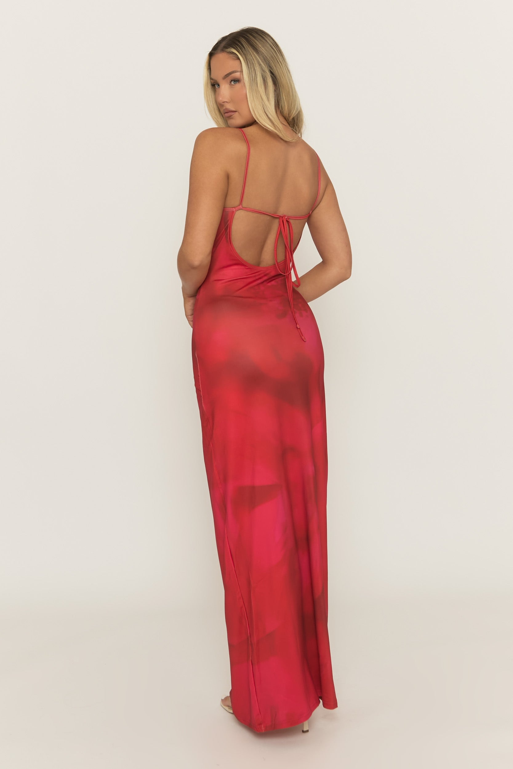 Summer vibes with this Red Printed Strappy Tie Back Maxi Dress. Featuring a jersey printed fabric, strappy design with tie back detail and maxi length. Embrace the season's trends with our thoughtfully curated pieces that are perfect for mixing and matching, allowing you to create countless outfit combinations. Add wedges for a glam edge.