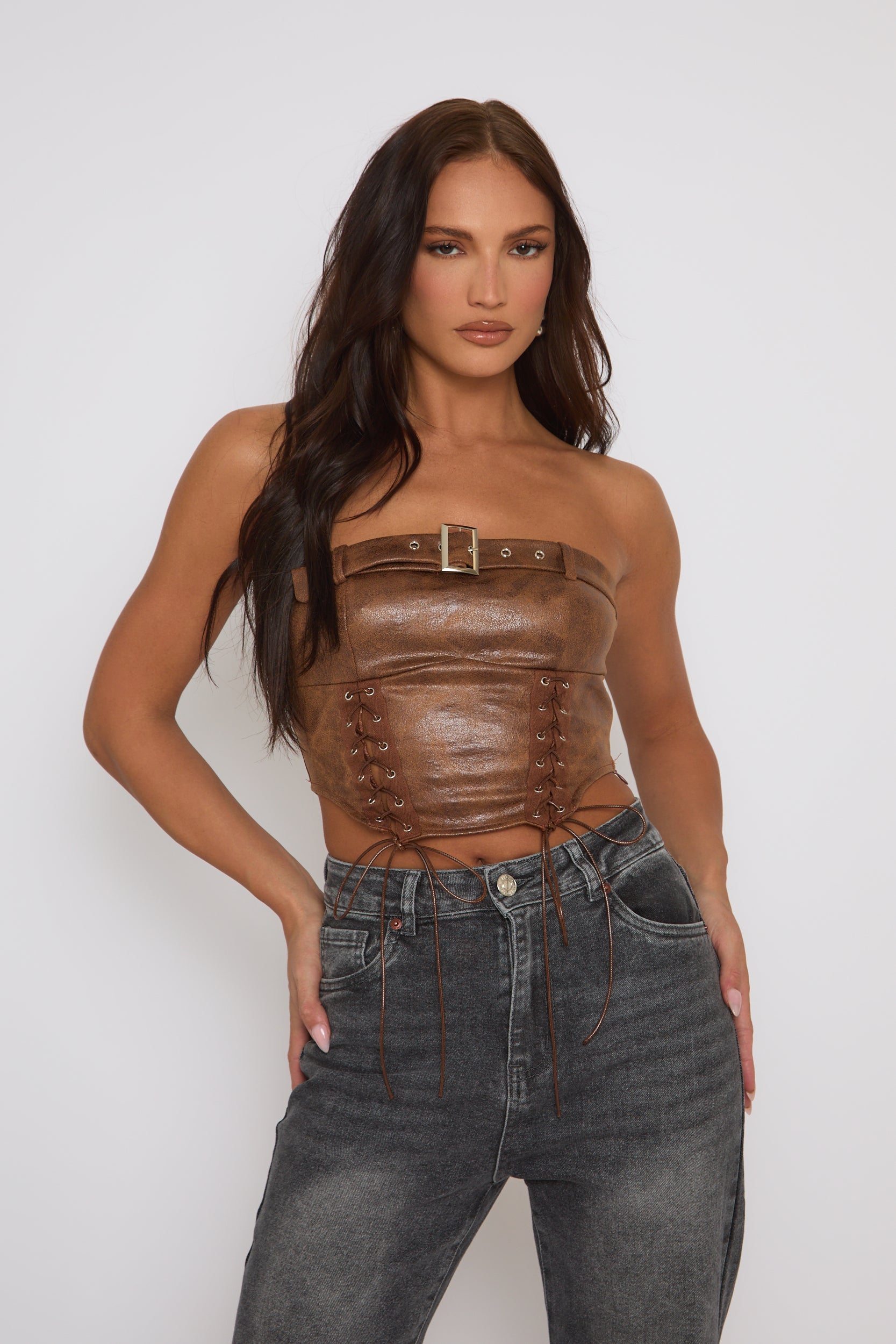 Tan Faux Leather Lace Front Bandeau Top - Sarina