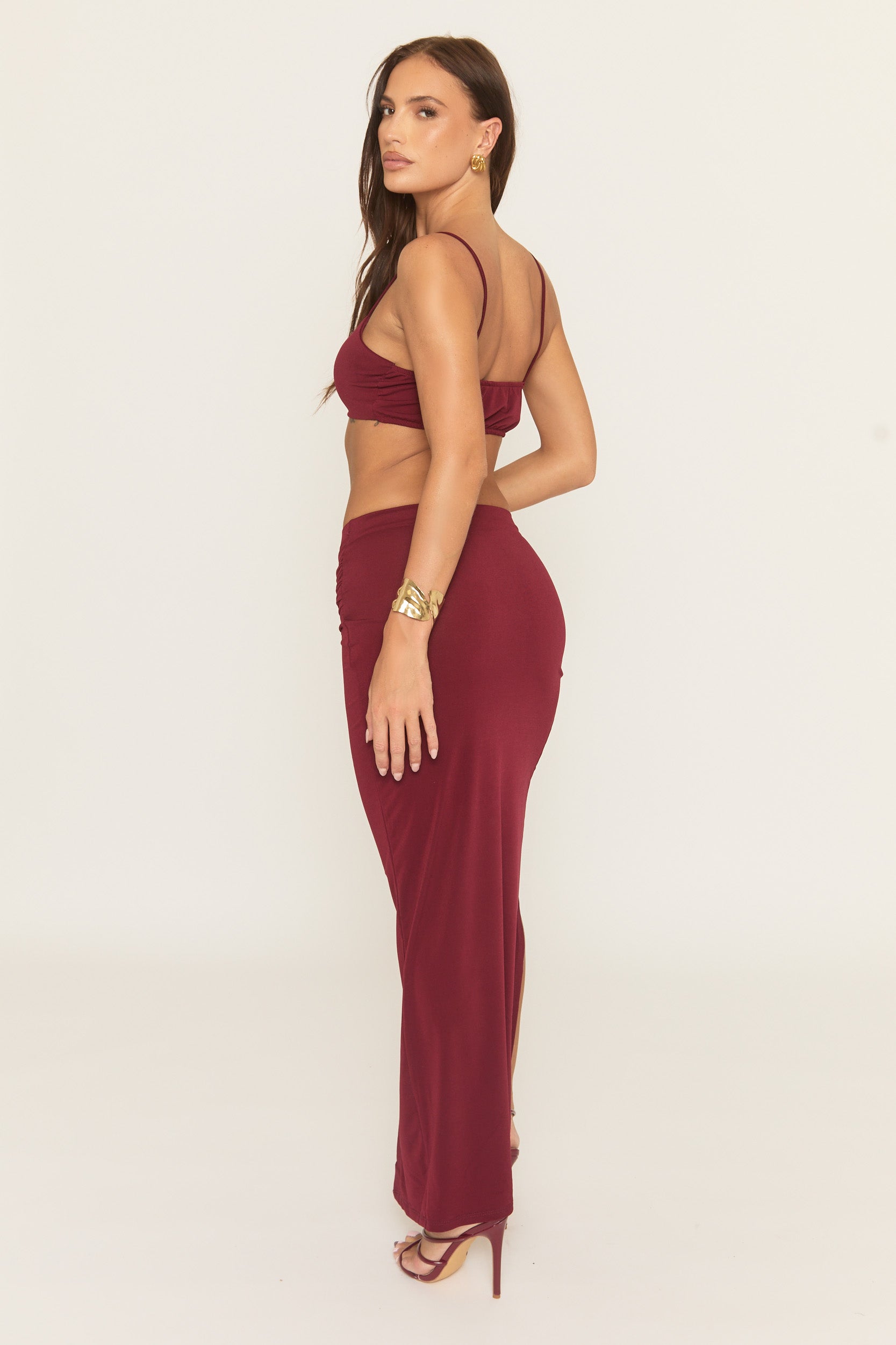 The perfect match in this Wine Gold Trim Top and Maxi Skirt Co-ord. Featuring a jersey fabric, bralet top with gold trim detail and the matching maxi length skirt with front split and ruching. Embrace the season's trends with our thoughtfully curated pieces that are perfect for mixing and matching, allowing you to create countless outfit combinations. Add your chosen accessories to complete.