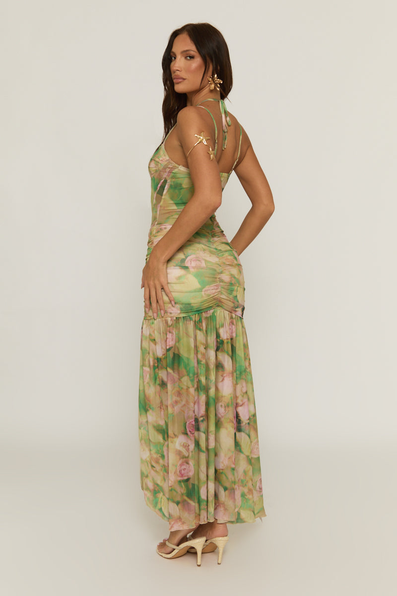 Green Floral printed fabric Corset Ruching Maxi length Dress Model wears size 8