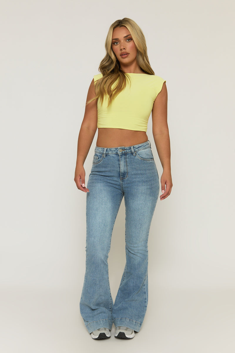 Mid Blue Washed Stretch Flared Leg Jeans