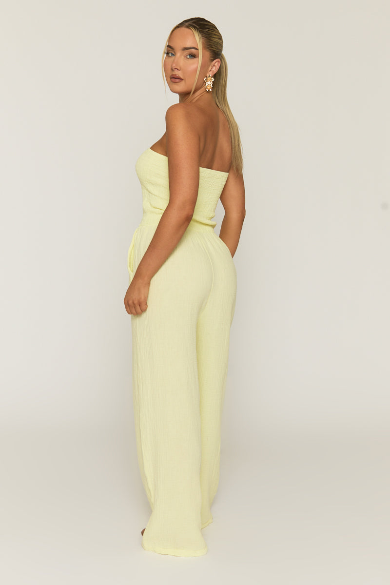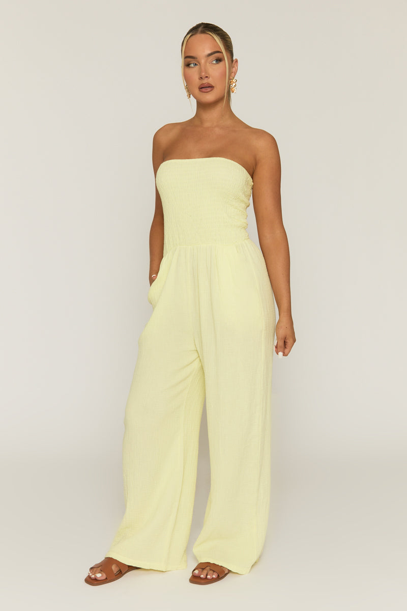 On trend for summer with this Yellow Crinkle Wide Leg Jumpsuit. Featuring a crinkle fabric, shirred detail, bandeau and wide leg. Embrace the season's trends with our thoughtfully curated pieces that are perfect for mixing and matching, allowing you to create countless outfit combinations. Wear with sandals for a look we're loving.