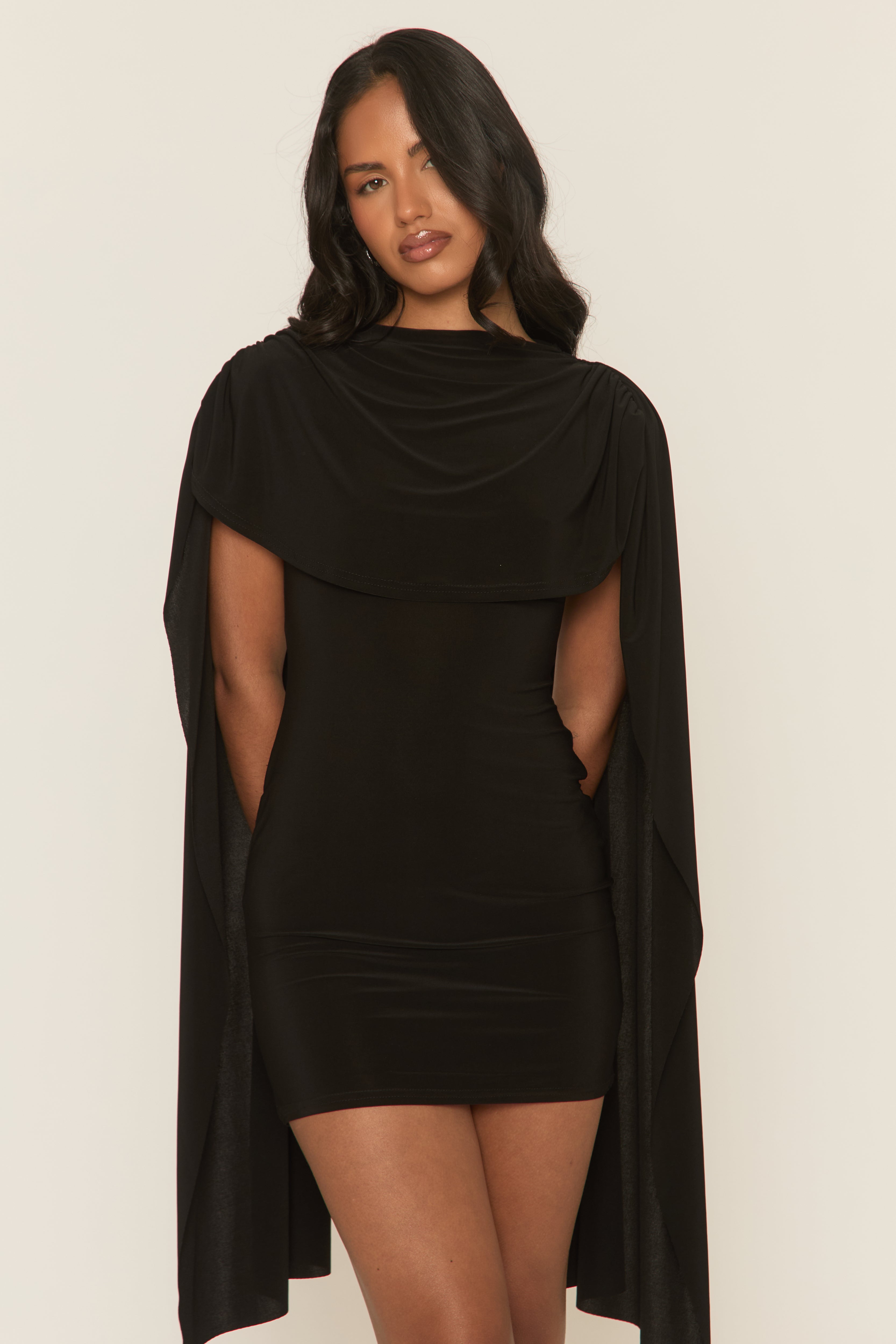 Ready to make a statement in this Black Gathered Cape Mini Dress. Featuring jersey fabric, gathered neckline design with long drape arm detail and mini length. Embrace the season's trends with our thoughtfully curated pieces that are perfect for mixing and matching, allowing you to create countless outfit combinations. Add heels and accessories for a luxe edge.