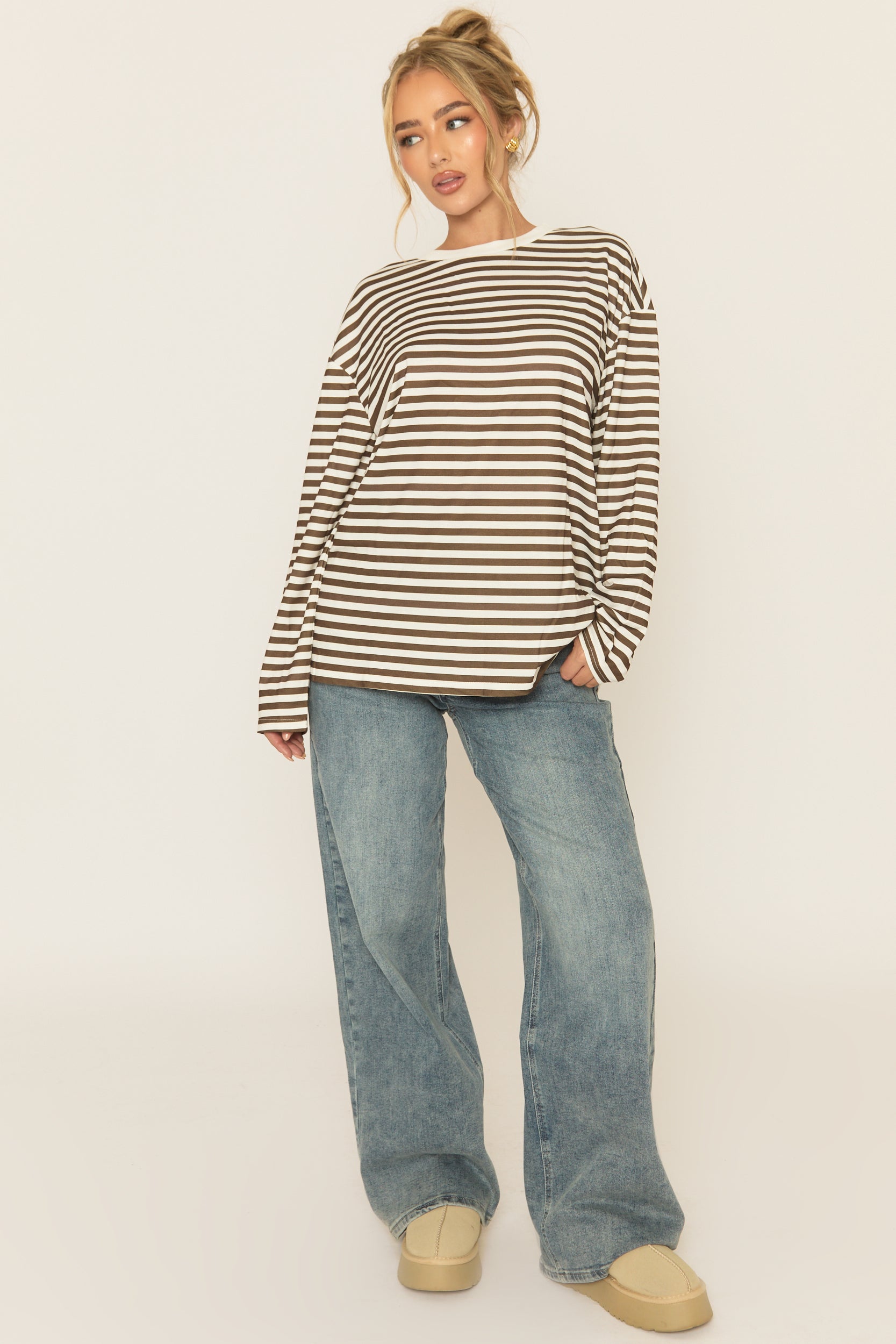 A fall favourite with this Brown Stripe Long Sleeve Crew Neck Top. Featuring a jersey striped fabric, long sleeves, round neckline and oversized fit. Embrace the season's trends with our thoughtfully curated pieces that are perfect for mixing and matching, allowing you to create countless outfit combinations. Wear with wide leg jeans and trainers for a chic look.