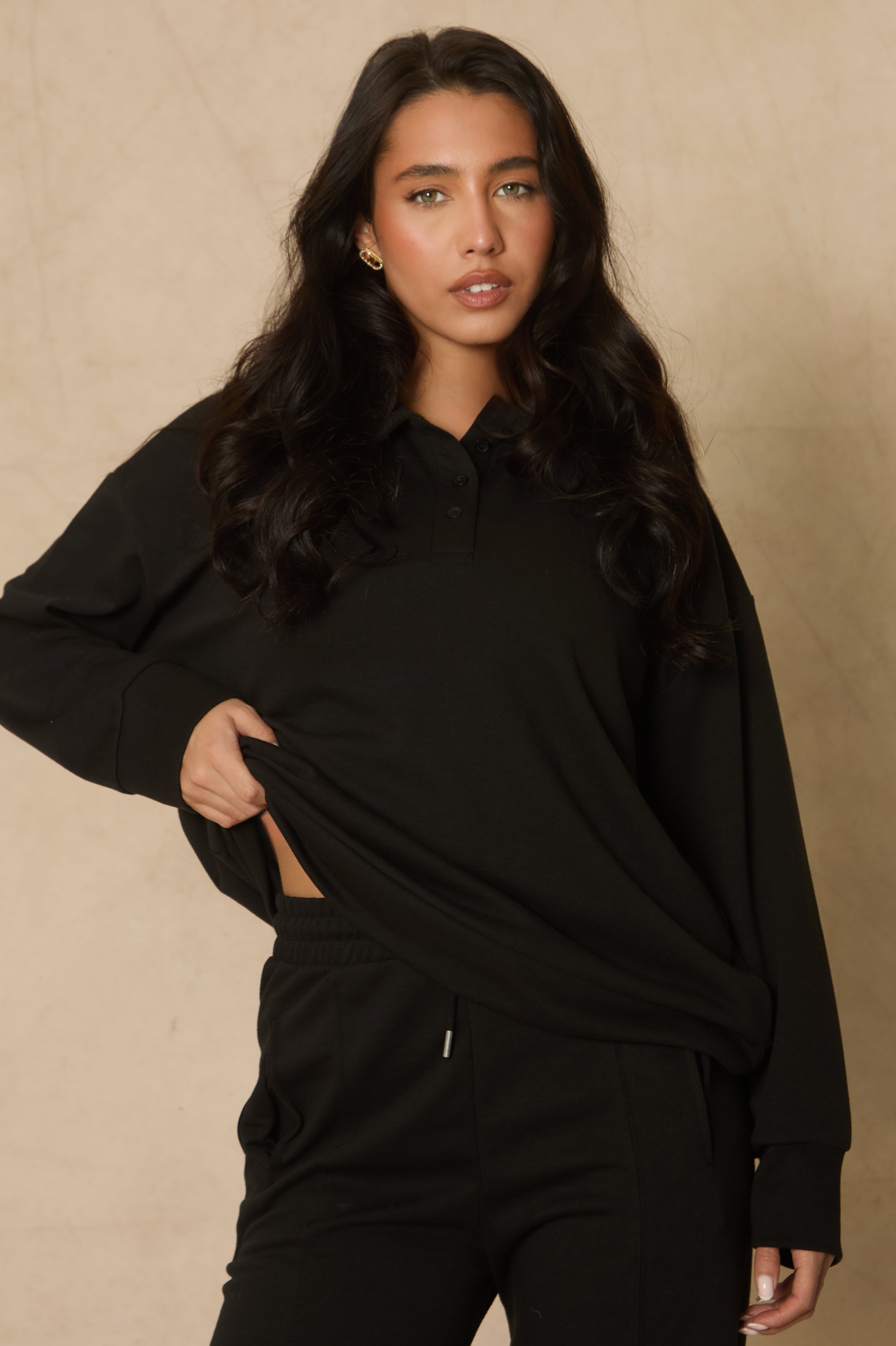 Level your loungewear with this Black Polo Collared Loungewear Co-ord Set. Featuring a jersey fabric, collared polo sweater design with button detail and the matching seam front straight leg joggers. Embrace the season's trends with our thoughtfully curated pieces that are perfect for mixing and matching, allowing you to create countless outfit combinations. Add faux fur boots for a luxe finish.
