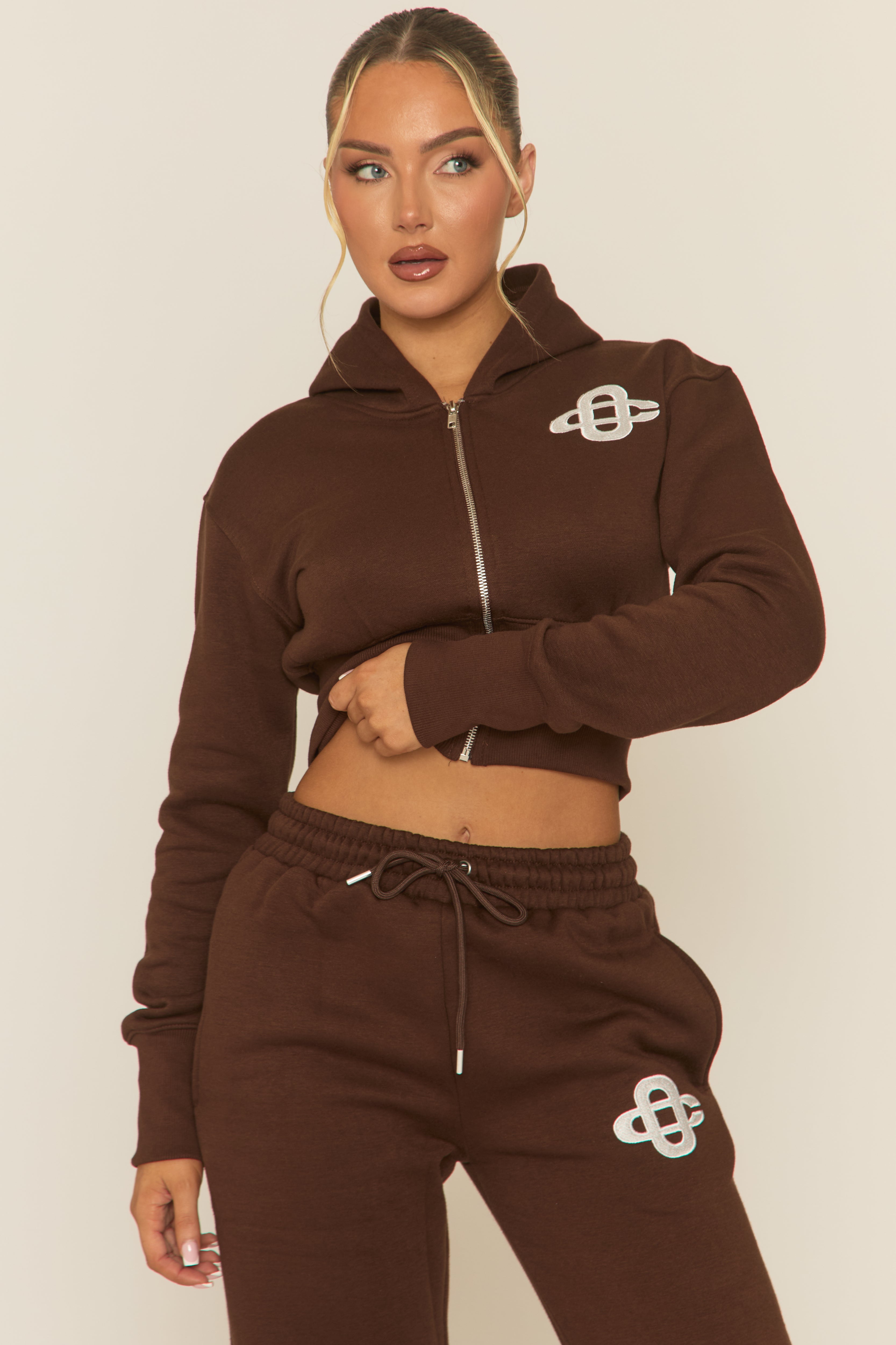 Levelled lounge in our Chocolate Contrast Motif Cropped Hoodie and Joggers Loungewear Set. Featuring a fleece lined jersey fabric, cropped design with contrast motif detail, zip up detail and the matching joggers. Embrace the season's trends with our thoughtfully curated pieces that are perfect for mixing and matching, allowing you to create countless outfit combinations. Add chunky trainers to complete