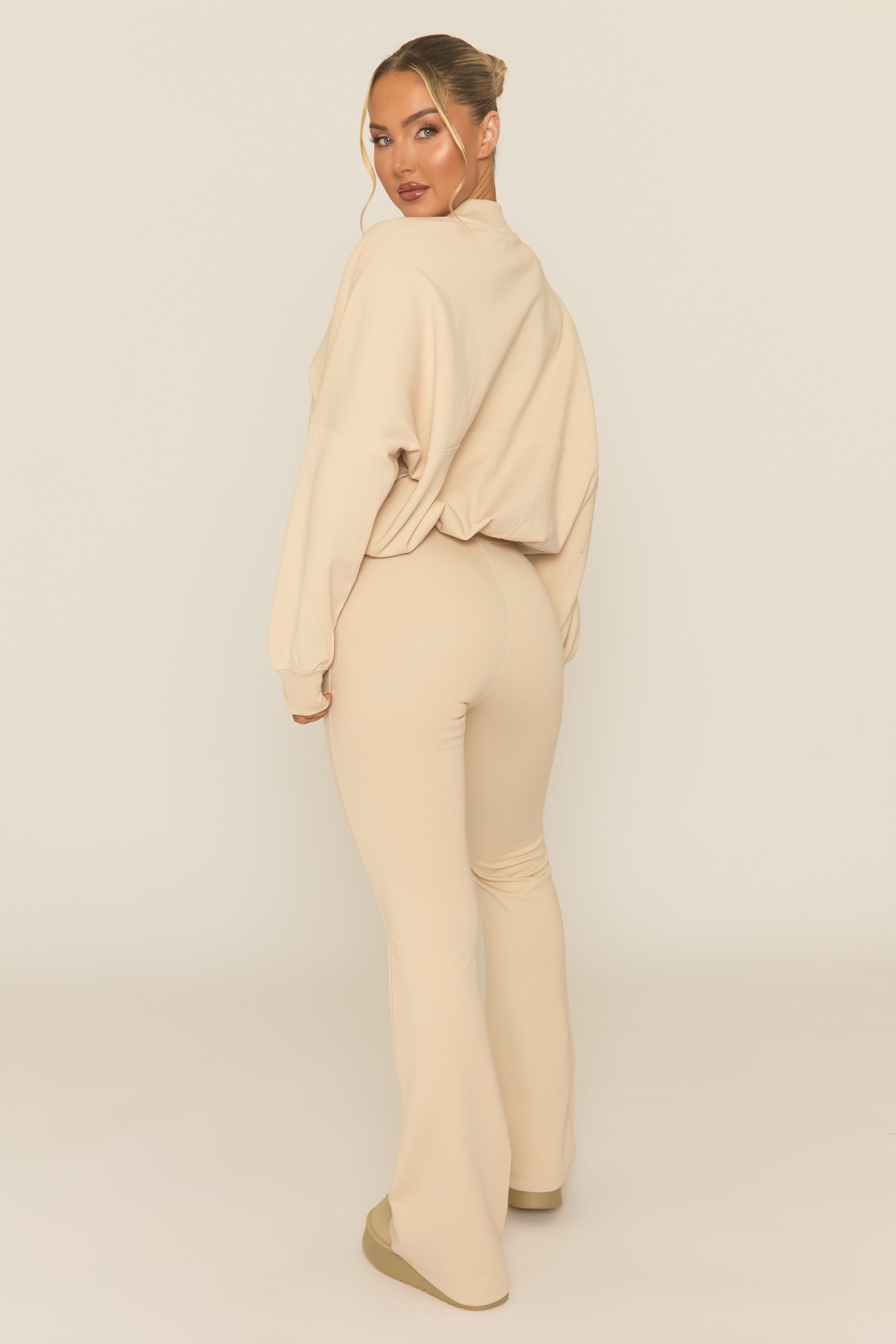 Beige Oversized Fit Zip Front Bomber Flare Leg Joggers Tie String Waist Model wears size 8