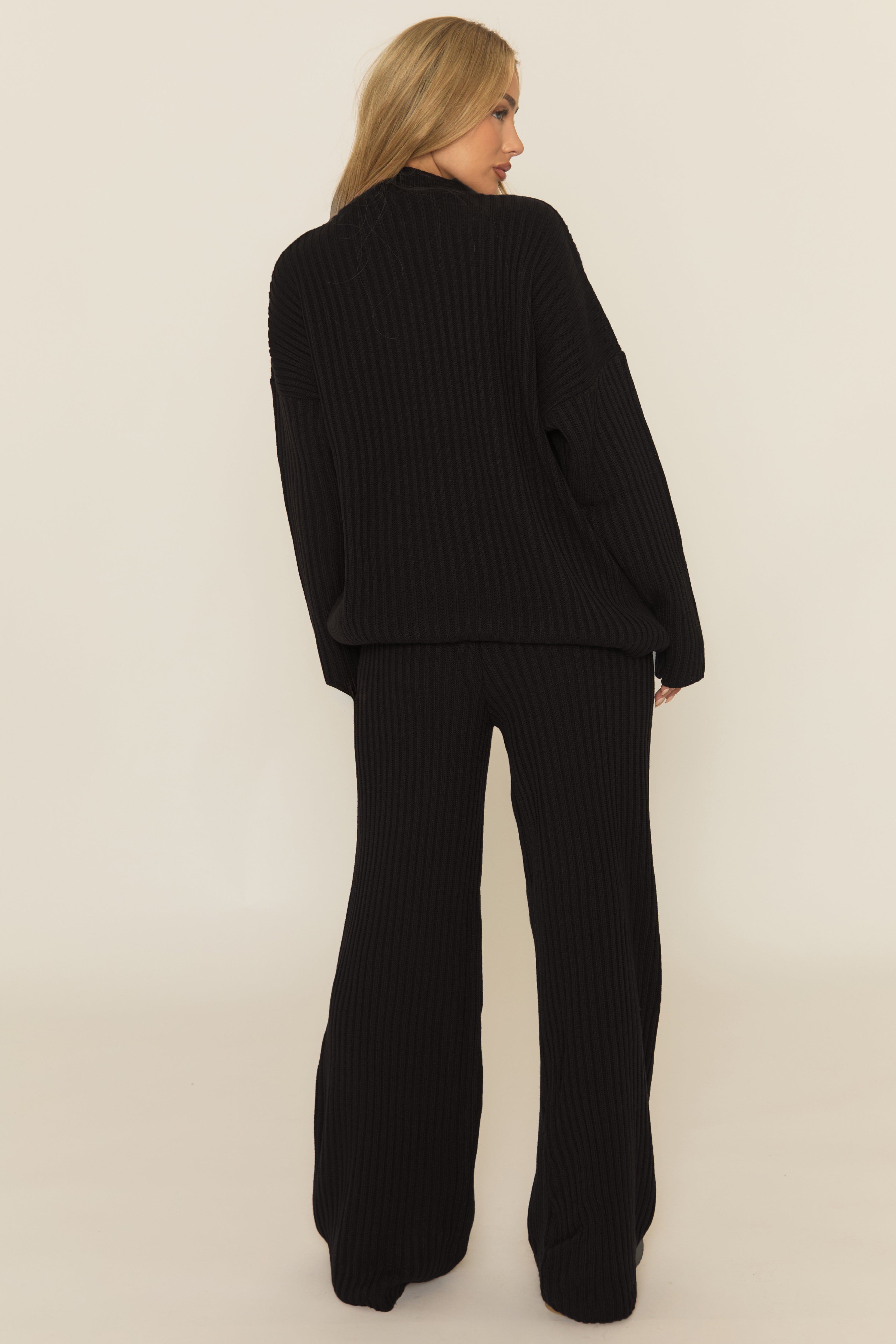 Black Contrast Motif Ribbed Knit Loungewear Co-ord Set - Ammae