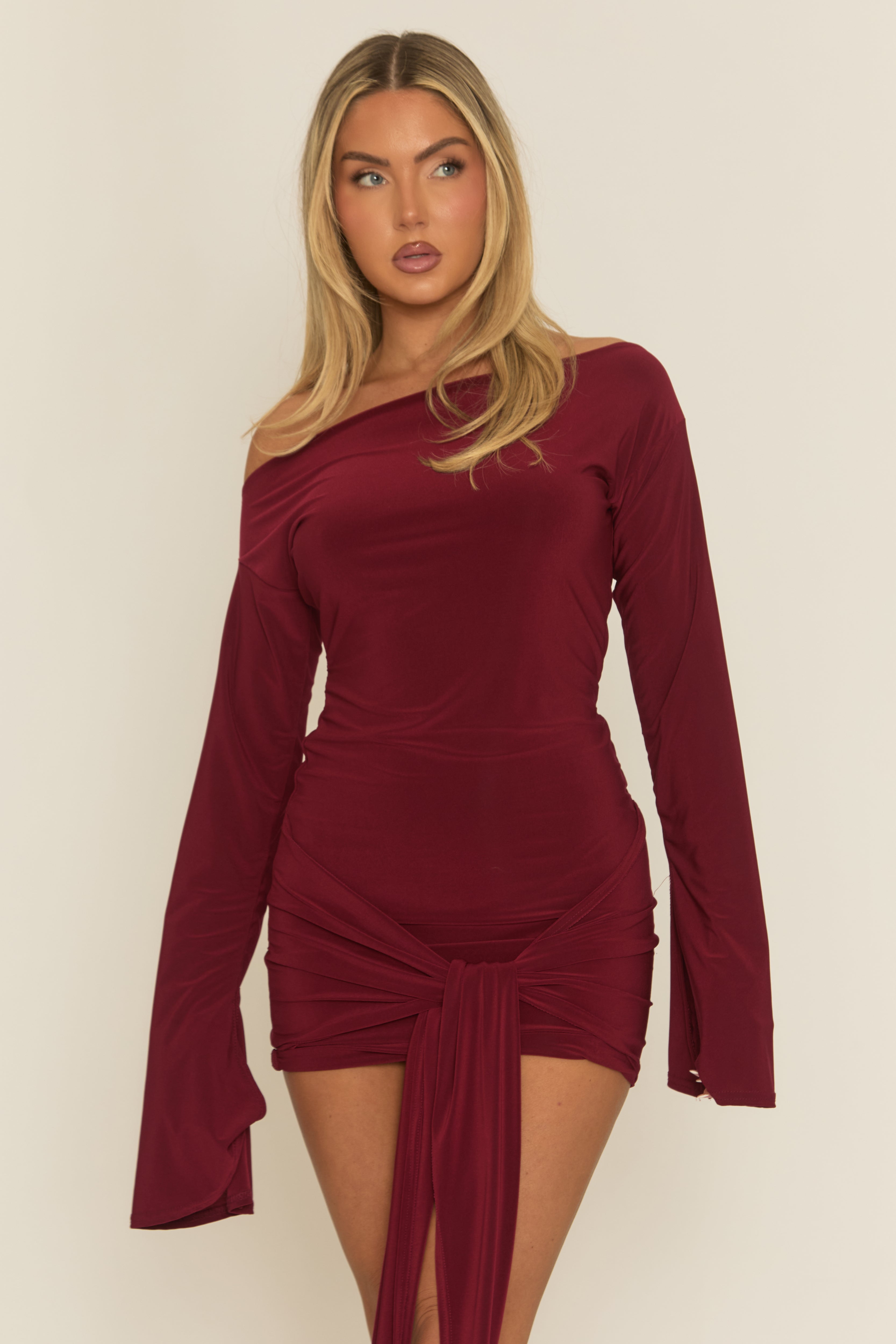 Burgundy Long Flared Sleeves Drape Detail Bodycon Mini Dress
