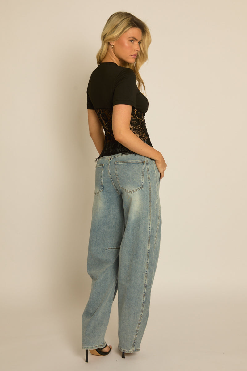Main character in this Black Lace Corset T-shirt. Featuring a jersey fabric, t-shirt design with short sleeves and sheer lace corset detail. Embrace the season's trends with our thoughtfully curated pieces that are perfect for mixing and matching, allowing you to create countless outfit combinations. Add wide leg jeans and a barely there heel for a head turning look.