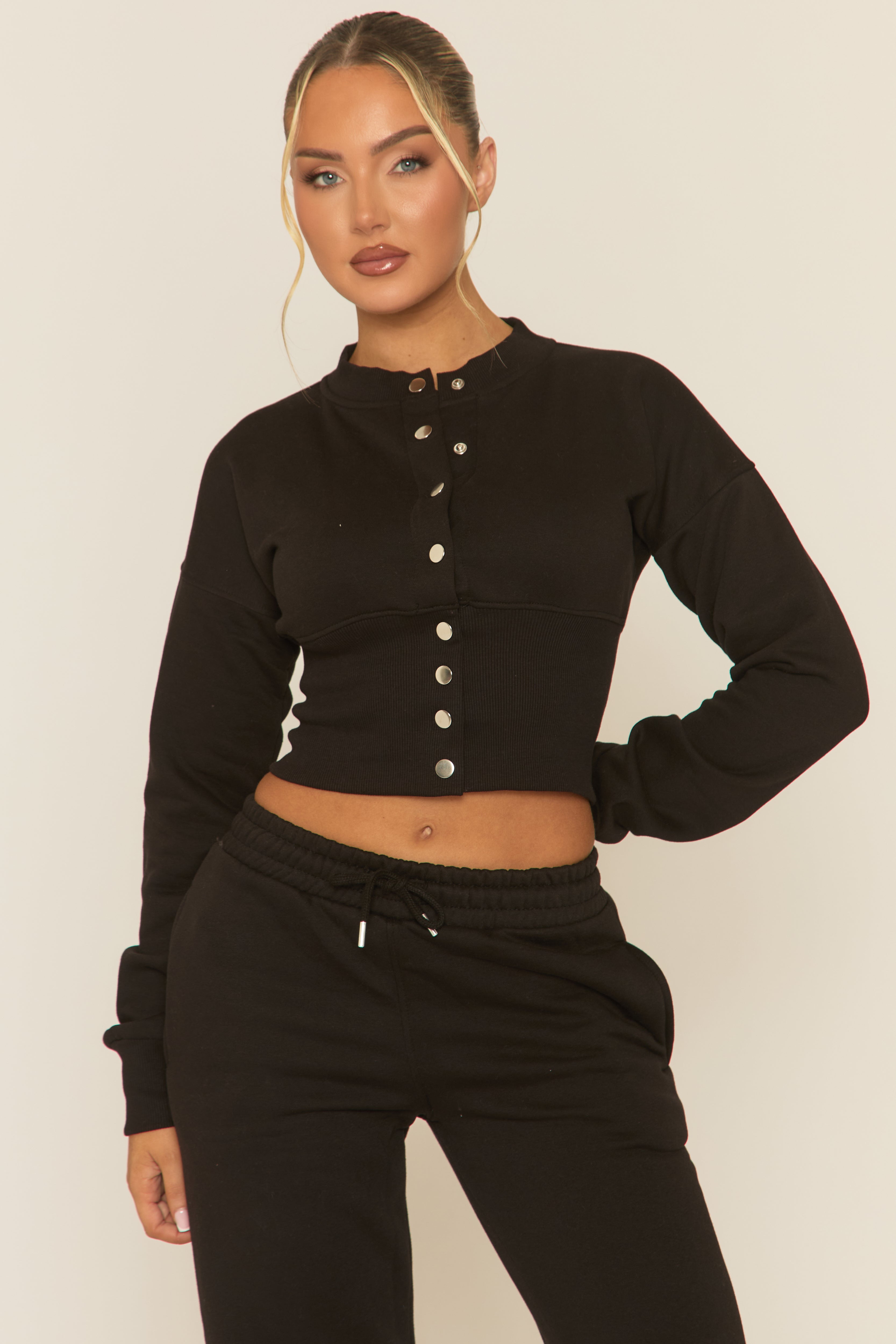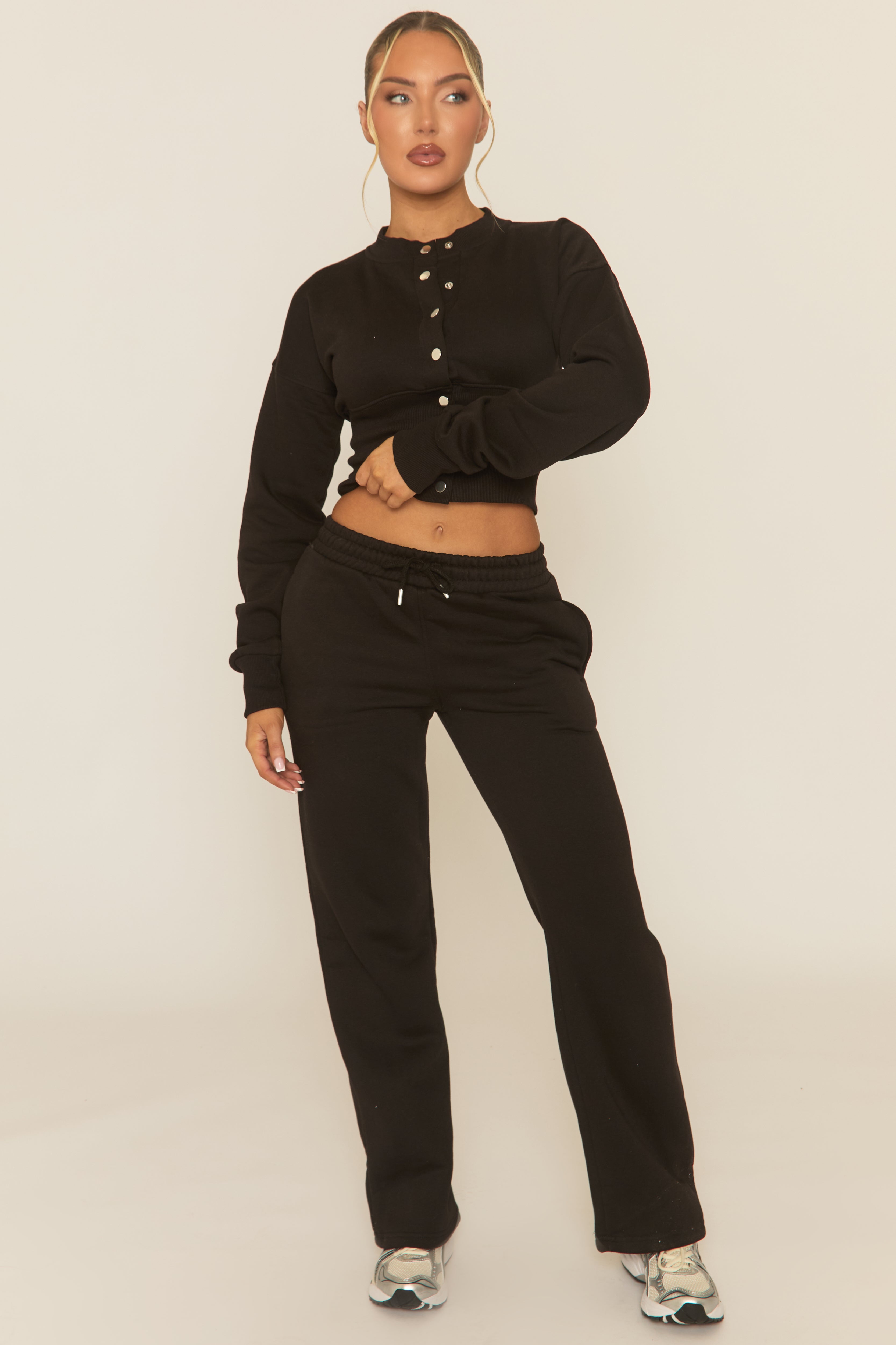 Black Popper Front Cinched Waist Sweatshirt and Wide Leg Trousers Loungewear Co-ord Set