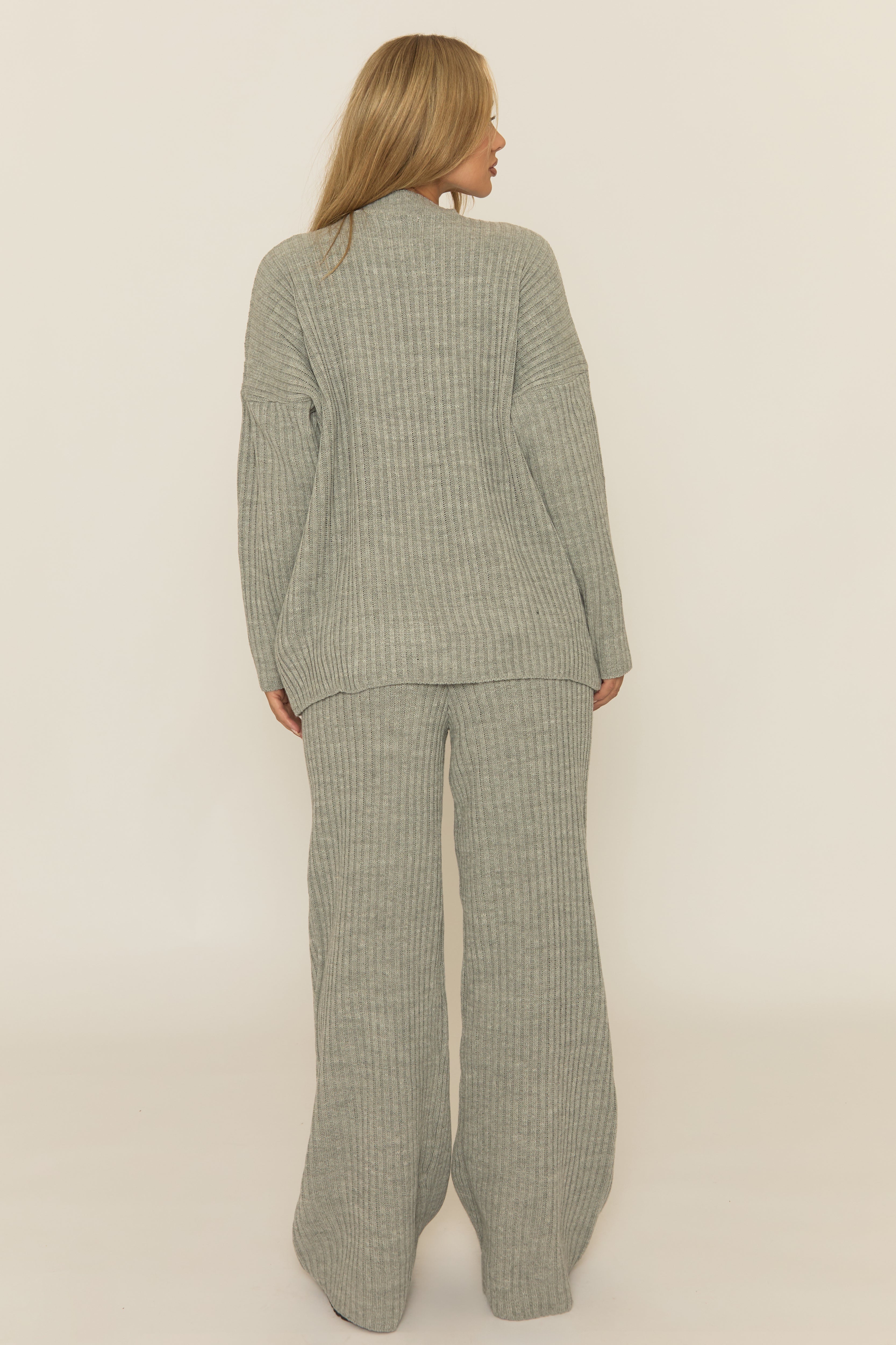 Grey Ribbed knit fabric Contrast motif High neck Oversized Top Wide leg Trousers Loungewear Co-ords Matching set Model wears size 8