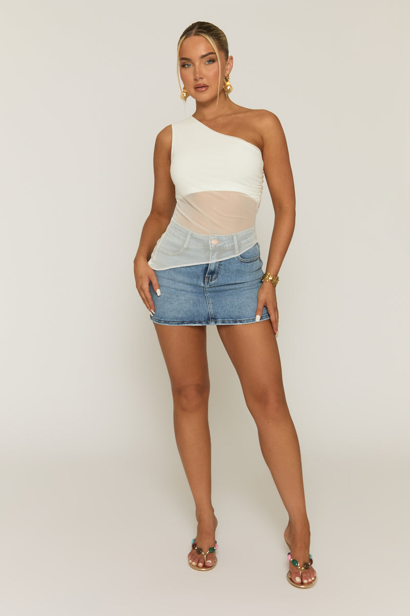 Make a bold statement in our White Mesh One Shoulder Asymmetric Top. This features mesh fabric top and an elegant asymmetric style to showcase the shoulders. Embrace the season's trends with our thoughtfully curated pieces that are perfect for mixing and matching, allowing you to create countless outfit combinations. Wear accessories of choice to complete your look