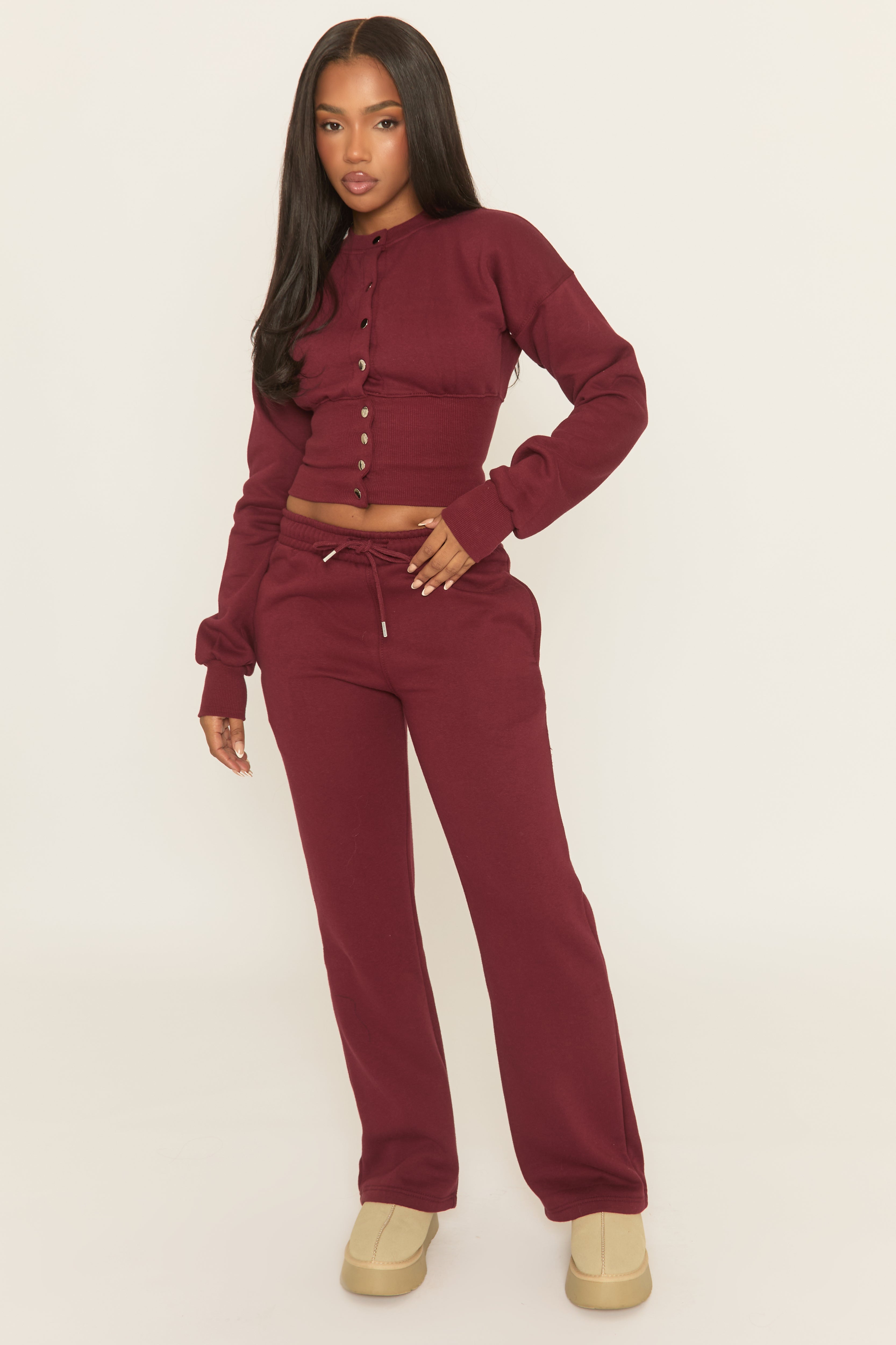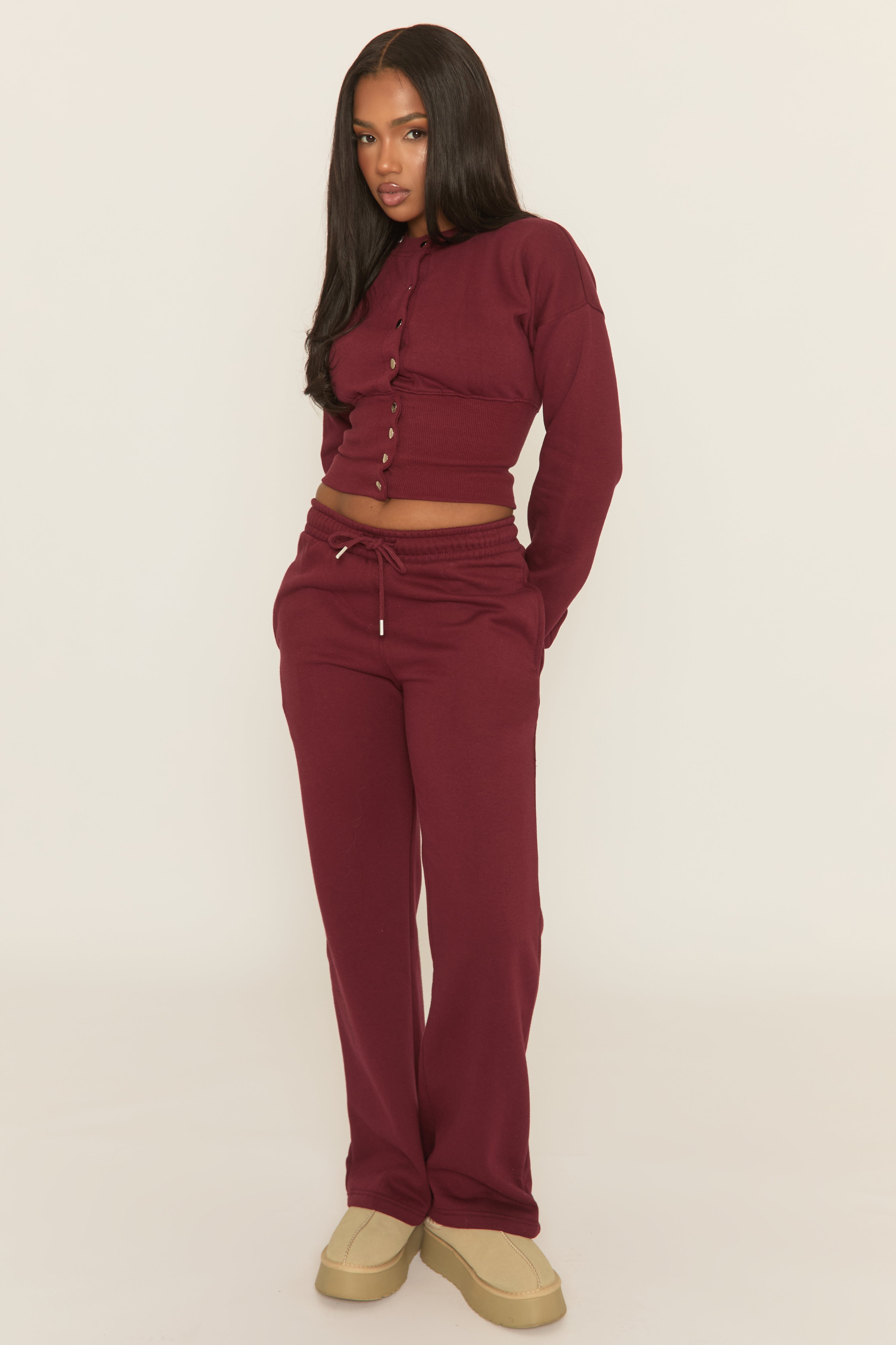 Wine Popper Front Cinched Waist Sweatshirt and Wide Leg Trousers Loungewear Co-ord Set - Neelam