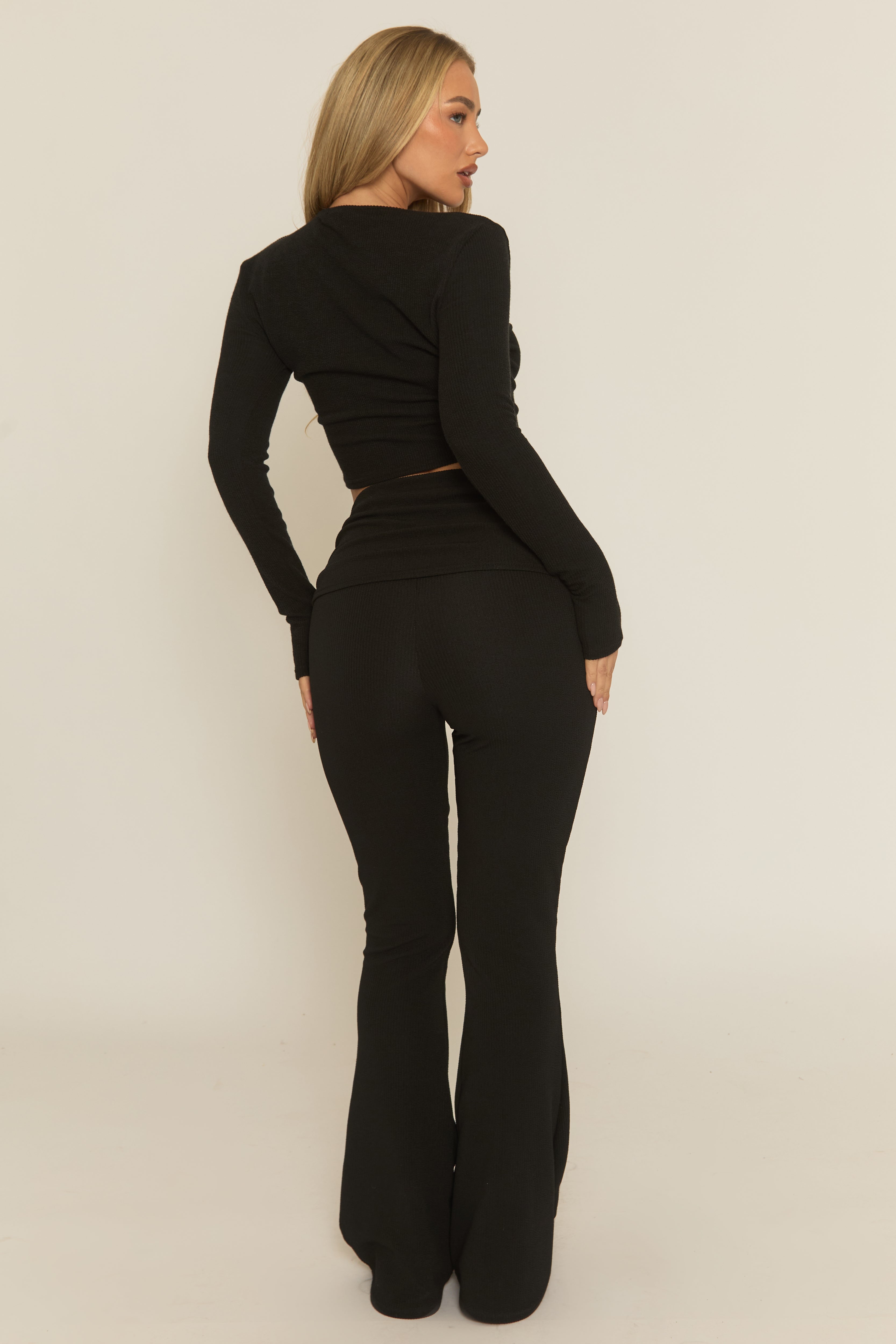 Matching in our Black Rib Fold Down Waist Loungewear Co-ord Set. Featuring a crinkle rib fabric, long sleeve top and the matching fold over waist trousers. Embrace the season's trends with our thoughtfully curated pieces that are perfect for mixing and matching, allowing you to create countless outfit combinations. Dress up or down with your chosen accessories
