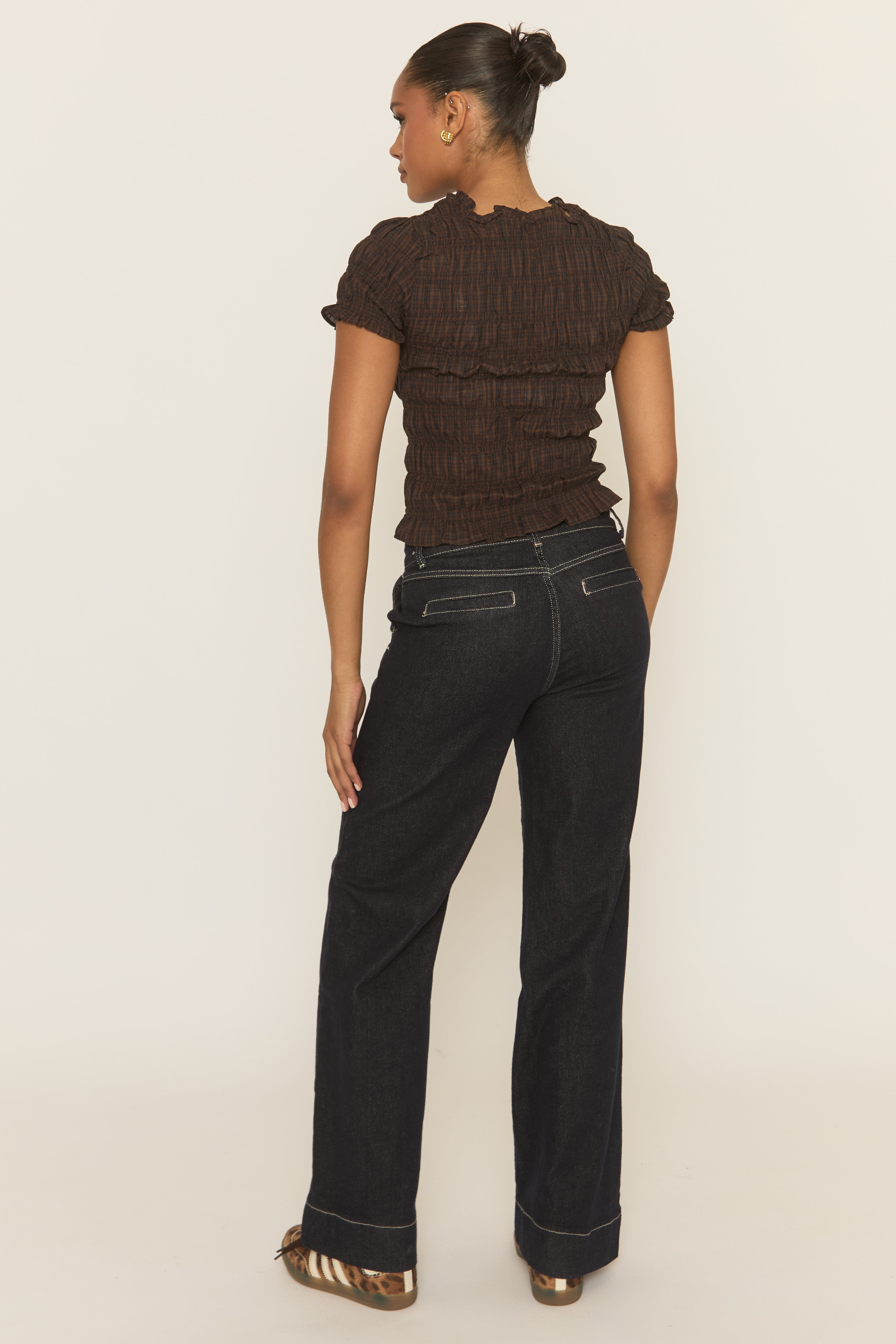Brown Check Shirred Top