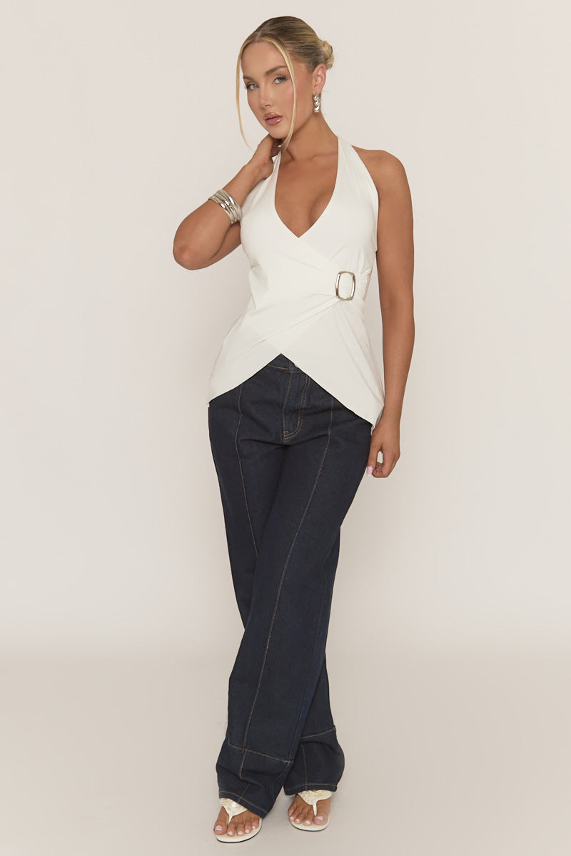 Add a glam edge with this White Wrap Front Trim Detail Halterneck Top. Featuring a slinky fabric, wrap front, metal trim detail and halterneck design with neck ties. Embrace the season's trends with our thoughtfully curated pieces that are perfect for mixing and matching, allowing you to create countless outfit combinations. Wear accessories of choice to complete your look.