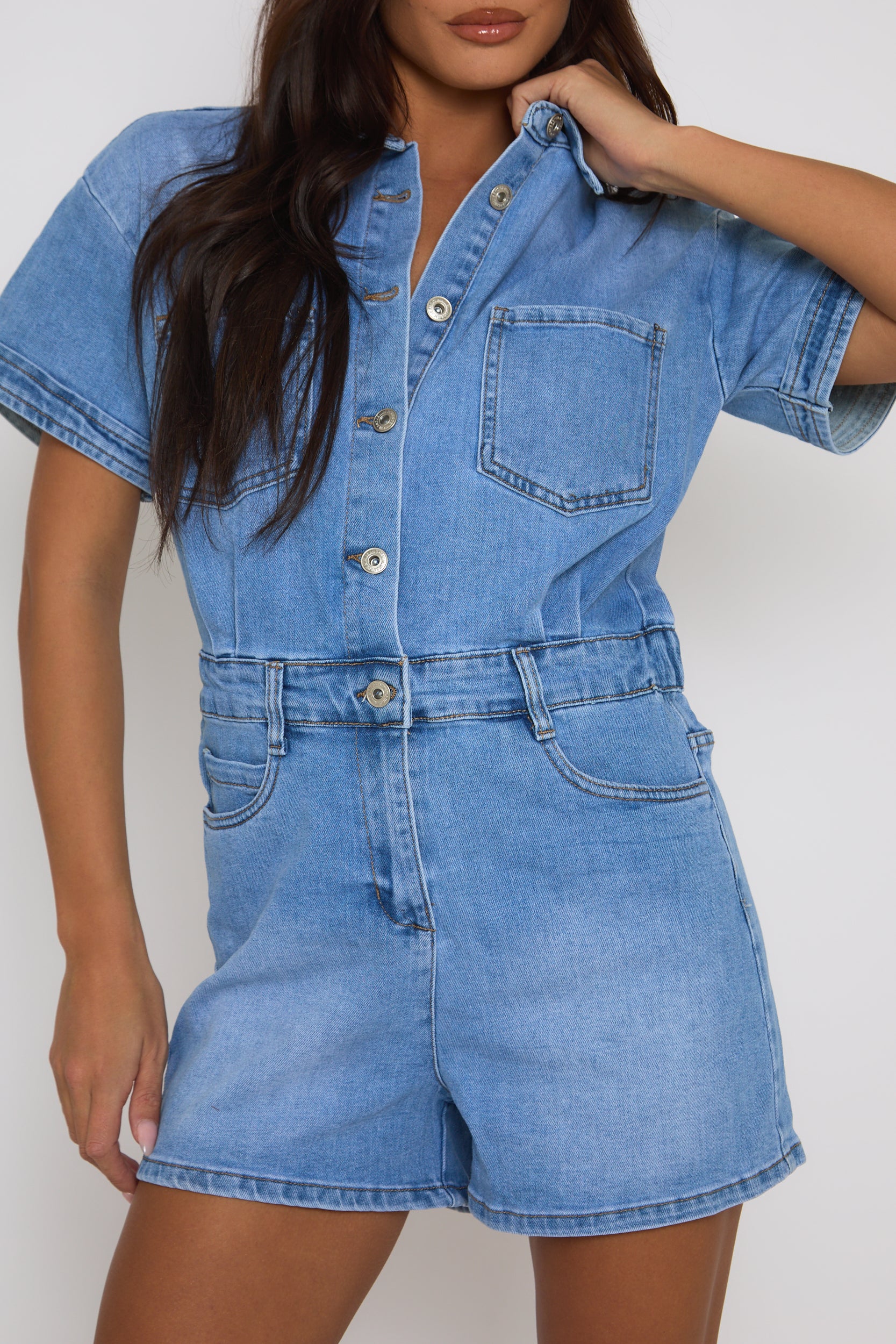 Your denim wardrobe will surely thank you for adding this Light Blue Denim Playsuit. Featuring a denim fabric, button up front, and short sleeves. Embrace the season's trends with our thoughtfully curated pieces that are perfect for mixing and matching, allowing you to create countless outfit combinations. Wear accessories of choice to complete your look