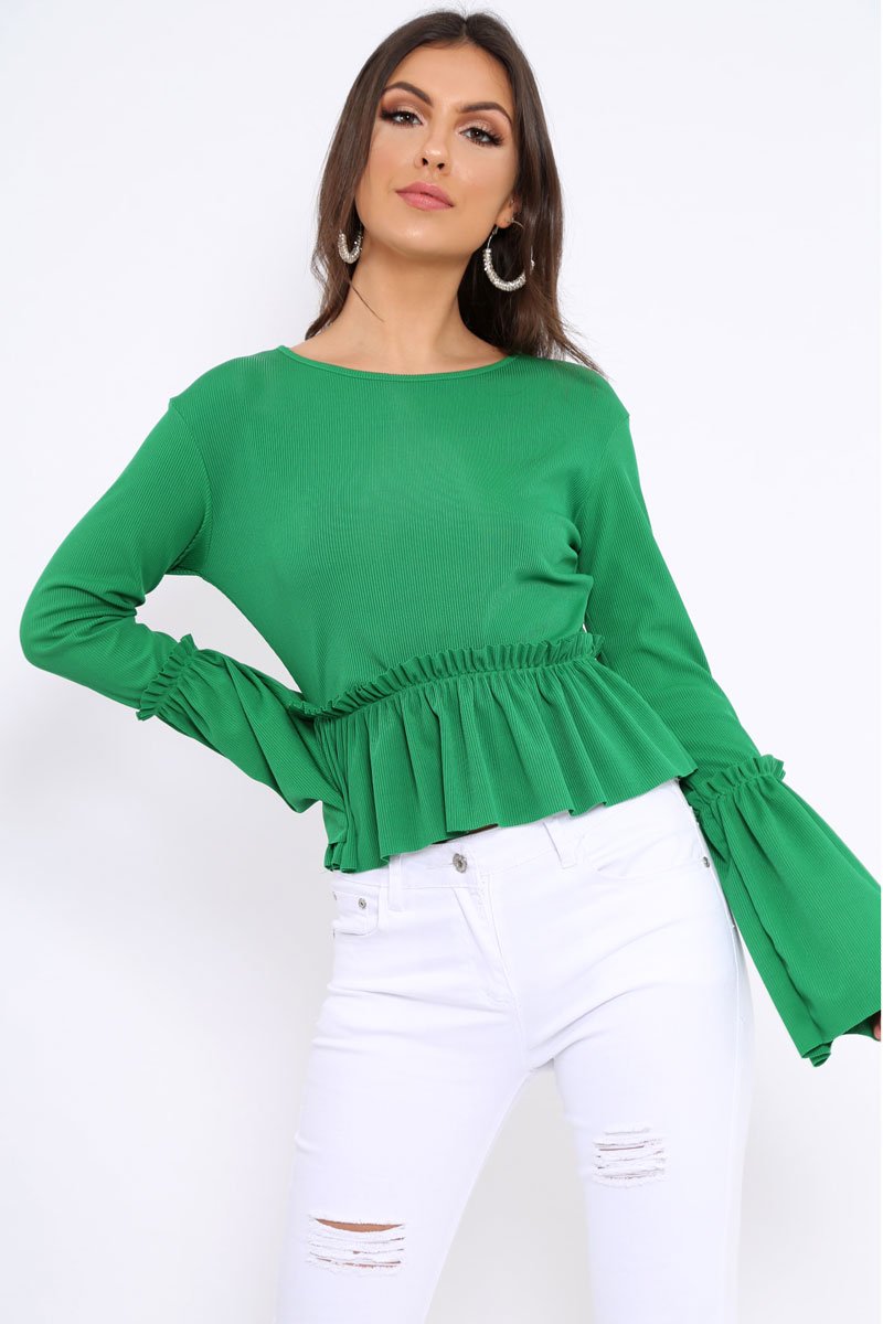 Slay in the Alaria Green Rib Ruffle Top. Featuring crew neck , ruffle sleeves and body with a rib style. Wear with PU Leggings and barely theres.
