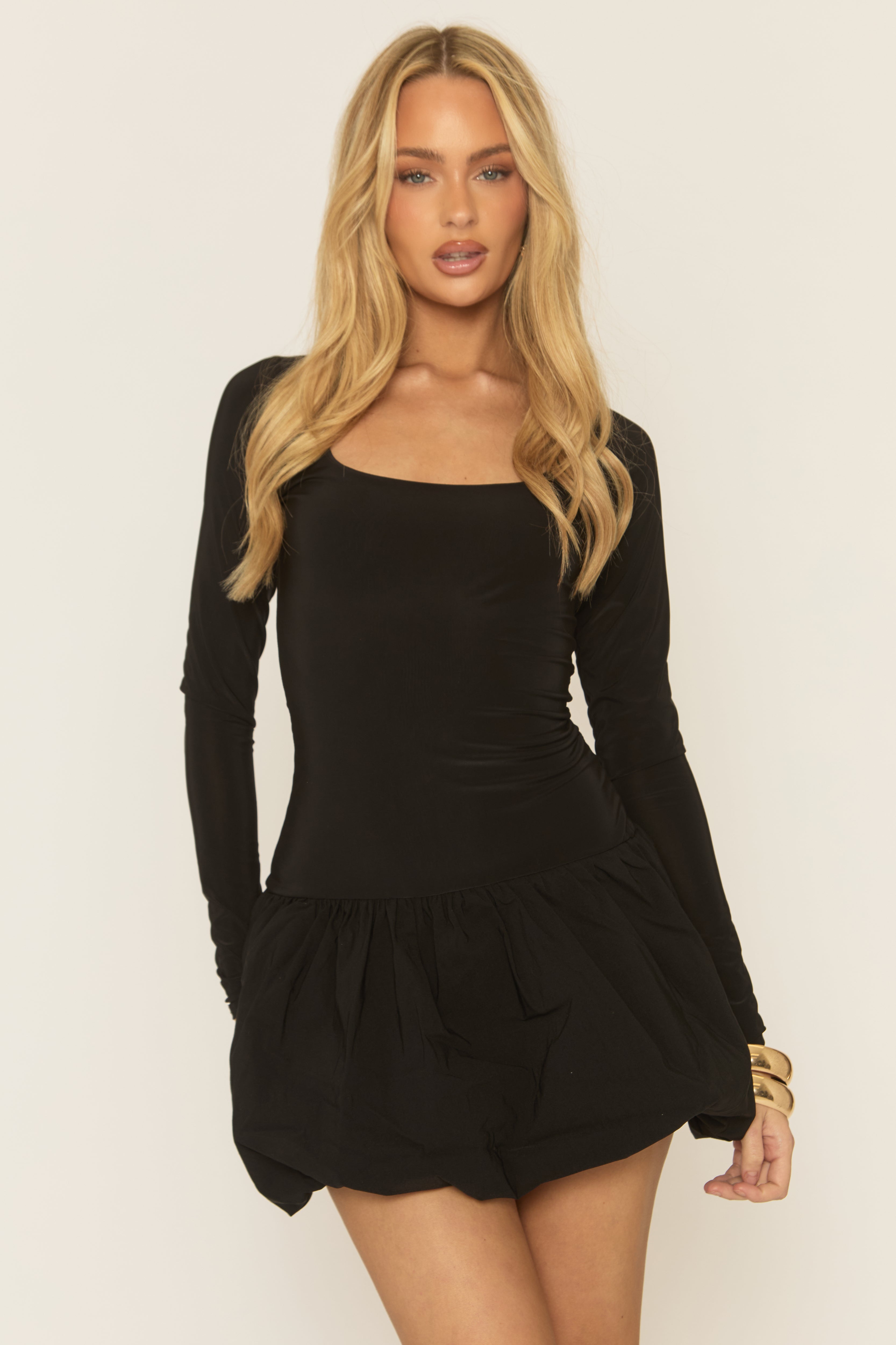 Black Square Neck Long Sleeve Puffball Mini Dress - Irenee
