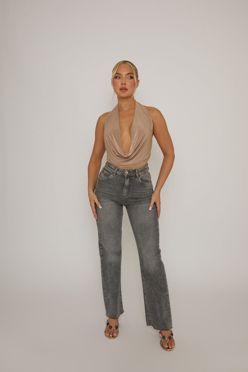 Stay on top of the trends this season in this Taupe Plunge Halterneck Top. Featuring a slinky fabric, cowl plunge neck and backless cropped top. Embrace the season's trends with our thoughtfully curated pieces that are perfect for mixing and matching, allowing you to create countless outfit combinations. Wear with accessories of choice to complete your look