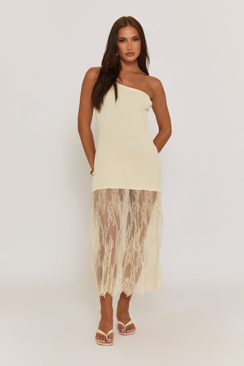 Butter Yellow Asymmetric Rib Knit and Lace Mix Dress – Miya