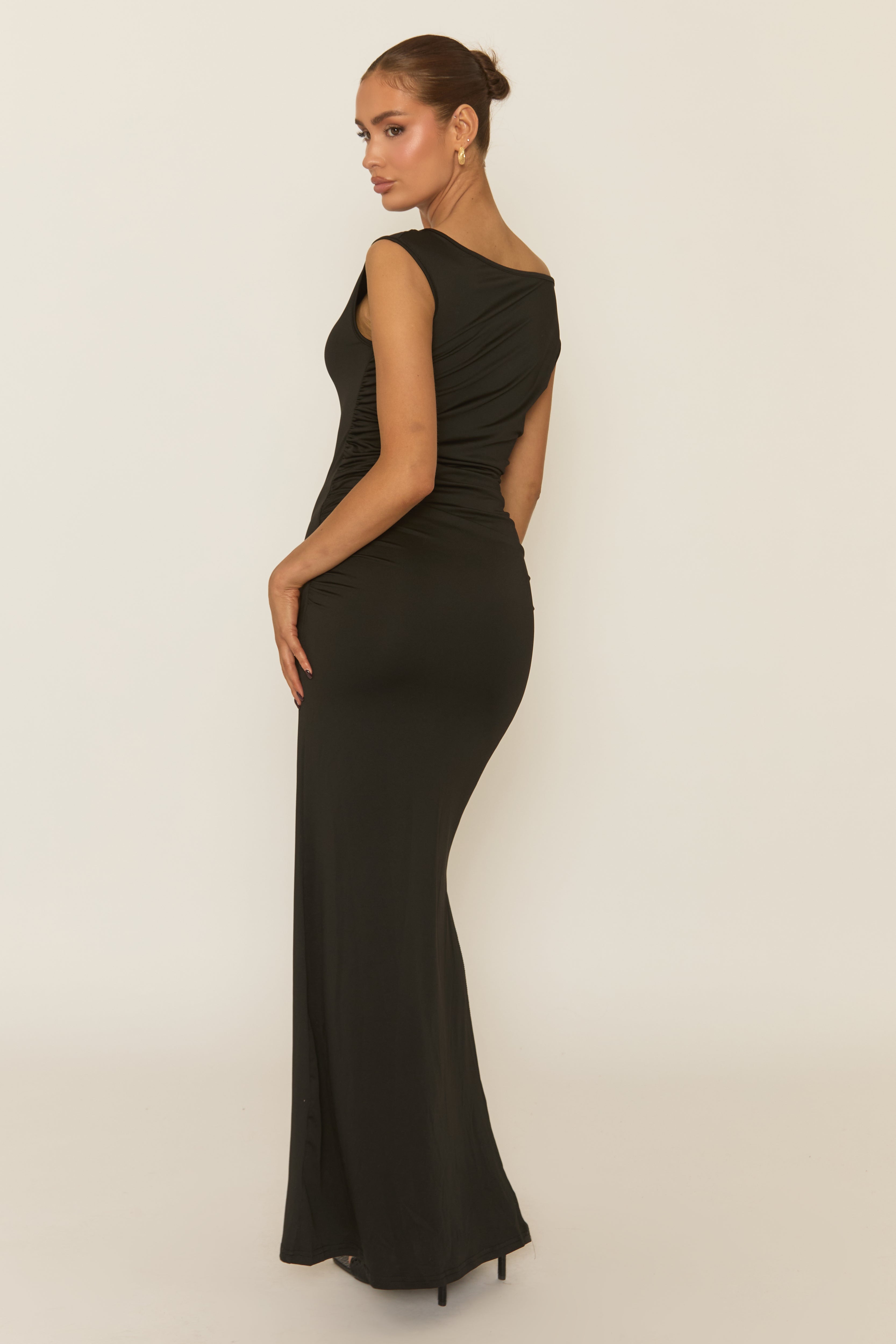 Show stopping in this Black Asymmetric Trim Detail Maxi Dress. Featuring slinky fabric, asymmetric design with gold trim detail, ruching, side skirt split and maxi length. Embrace the season's trends with our thoughtfully curated pieces that are perfect for mixing and matching, allowing you to create countless outfit combinations. Add gold accessories for a glam edge.