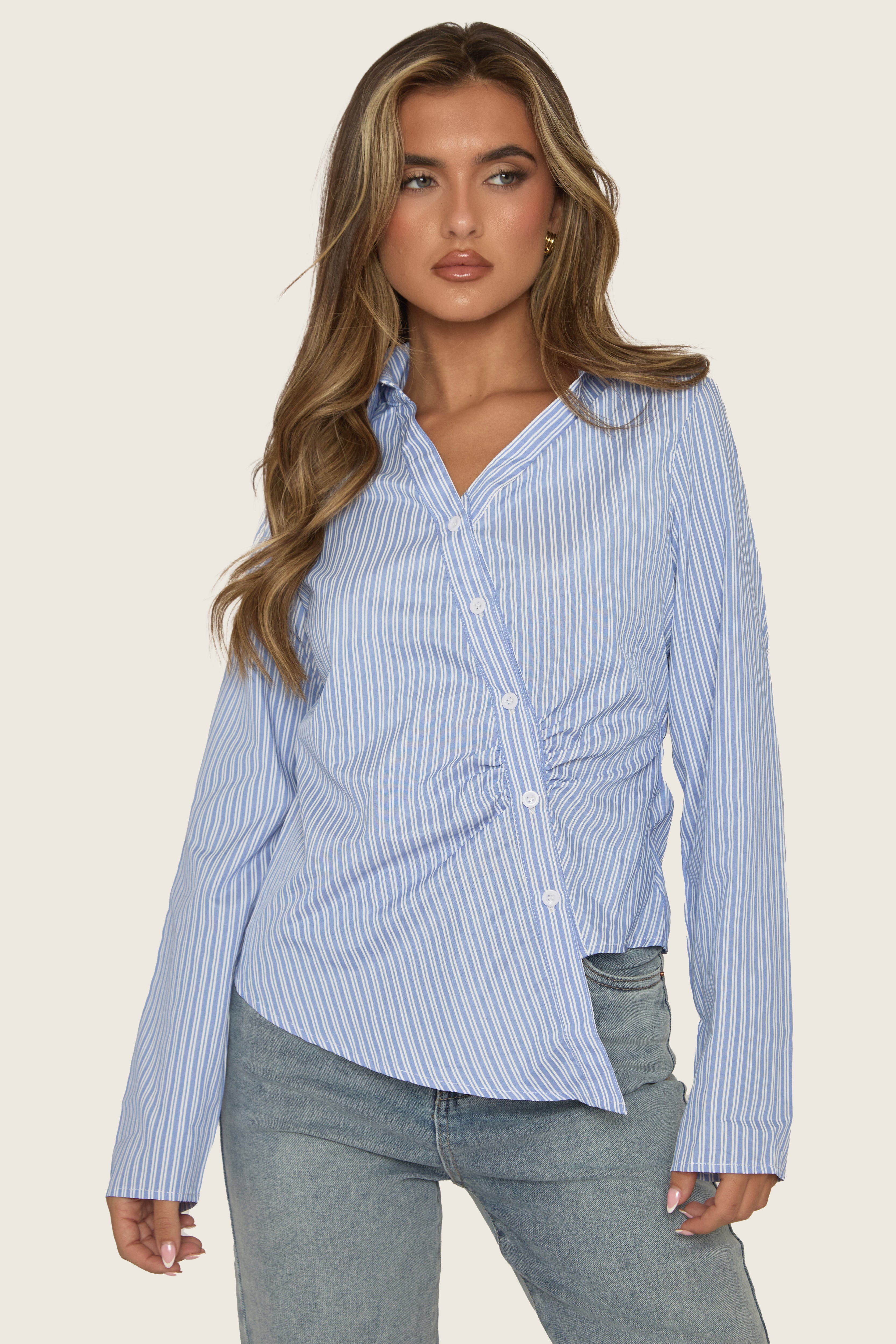 Blue Stripe Asymmetric Button Detail Shirt - Ollia